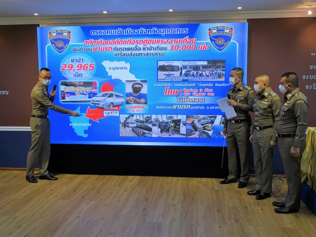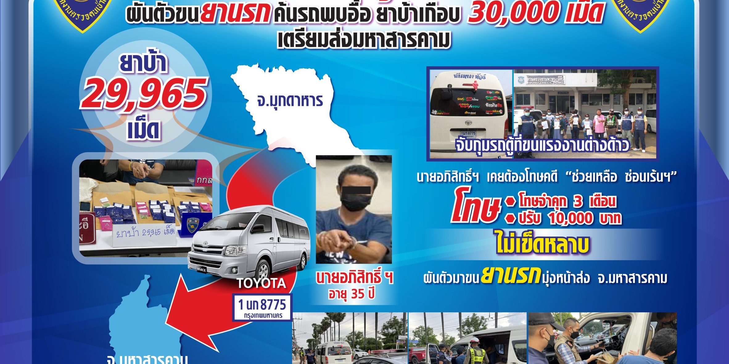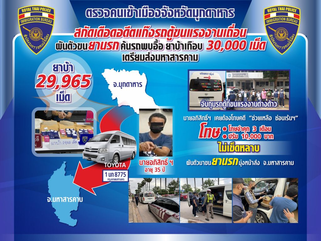 ตม.จ.มุกดาหาร ได้ทำการสืบสวนโดยสามารถจับกุมนายอภิสิทธิ์ฯ อายุ 35 ปี ซึ่งเคยต้องโทษกรณีลักลอบขนคนต่างด้าวสัญชาติลาว จำนวน 9 คน หลบหนีเข้าเมือง ศาลพิพากษาถึงที่สุดให้รับโทษ จำคุก 3 เดือน ปรับ 10,000 บาท โทษจำคุกให้รอลงอาญา 2 ปี ขณะขับรถตู้ขนยายาบ้าจำนวน 29,965 เม็ด มุ่ง จ.มหาสารคาม