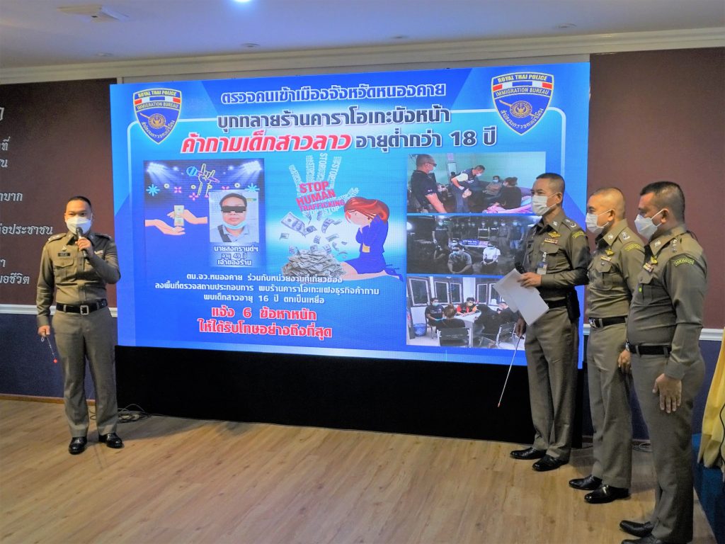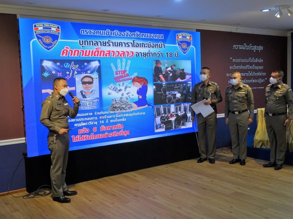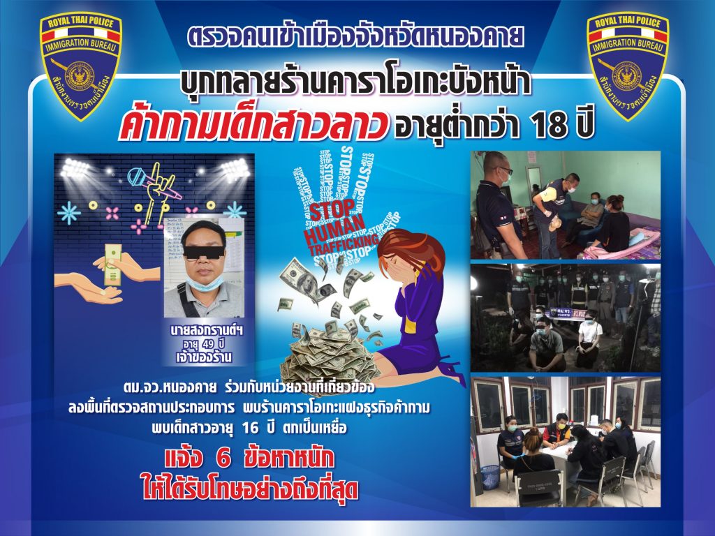 ตม.จ.หนองคาย ได้ทำการสืบสวนคนต่างด้าวที่ลักลอบเข้ามาในราชอาณาจักร เพื่อหาปลายทางการลักลอบว่ามีเป้าหมายไปยังที่ใด ทำงานประเภทใด จนทราบว่า กลุ่มคนต่างด้าวสัญชาติลาวบางส่วน มักจะลักลอบเข้ามาทำงานขายบริการ ณ ร้านคาราโอเกะแห่งหนึ่ง ในพื้นที่ จ.หนองคาย ซึ่งมีการลักลอบรับคนต่างด้าวสัญชาติลาวเข้าทำงานโดยผิดกฎหมายและพบว่ามีการลักลอบค้าประเวณีแอบแฝง ซึ่งทางร้านได้ลักลอบเปิดให้นักท่องเที่ยวขาประจำมาใช้บริการกินดื่มและซื้อบริการทางเพศ โดยใช้วิธีปิดไฟภายในร้าน เพื่ออำพรางเจ้าหน้าที่ให้หลงเชื่อว่าร้านดังกล่าวไม่ได้เปิดบริการ ซึ่งจากการสืบสวนพบว่ามีการนำเอาหญิงชาวลาวอายุ