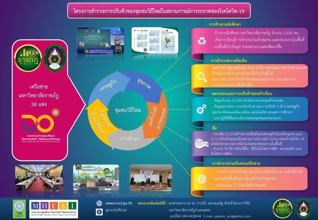 รศ.ดร.ปาจรีย์ ผลประเสริฐ มหาวิทยาลัยราชภัฎกำแพงเพชร หัวหน้าโครงการวิจัย เปิดเผยว่า ตนและเครือข่ายมหาวิทยาลัยราชภัฏ (มรภ.) 38 แห่ง ทำการวิจัยเรื่อง “การปรับตัวของชุมชนวิถีใหม่ในสถานการณ์การระบาดของโรคโควิด-19” ในพื้นที่ความรับผิดชอบครอบคลุม 77 จังหวัดทั่วประเทศ โดยได้รับทุนจากสำนักงานการวิจัยแห่งชาติ (วช.) กระทรวงการอุดมศึกษา วิทยาศาสตร์ วิจัยและนวัตกรรม (อว.) และการสนับสนุนจาก (ทปอ.มรภ.) ผลการวิจัยพบว่า โควิด-19 ส่งผลกระทบต่อประชาชนและทำให้เกิดการปรับเปลี่ยนเป็นวิถีชีวิตใหม่ ใน 5 ประเด็น ได้แก่ เศรษฐกิจ,สังคมและสิ่งแวดล้อม,สุขภาวะ,เทคโนโลยีสารสนเทศ และ การศึกษา แต่อย่างไรก็ตามในสถานการณ์ดังกล่าว ยังมีการจ้างงานนักศึกษาเพื่อลดผลกระทบด้านเศรษฐกิจ มีการสำรวจความคิดเห็นเกี่ยวกับโควิด จำนวน 8 เรื่อง ทำให้ประชาชนได้แสดงความคิดเห็นต่อนโยบาย มาตรการเพื่อนำไปเป็นแนวทางในการแก้ปัญหา รวมทั้งมีการจัดทำสื่อในรูปแบบต่างๆ จำนวน 76 รายการ เพื่อสร้างความเชื่อมั่นและการป้องกันการแพร่ระบาดของโรคโควิด-19
