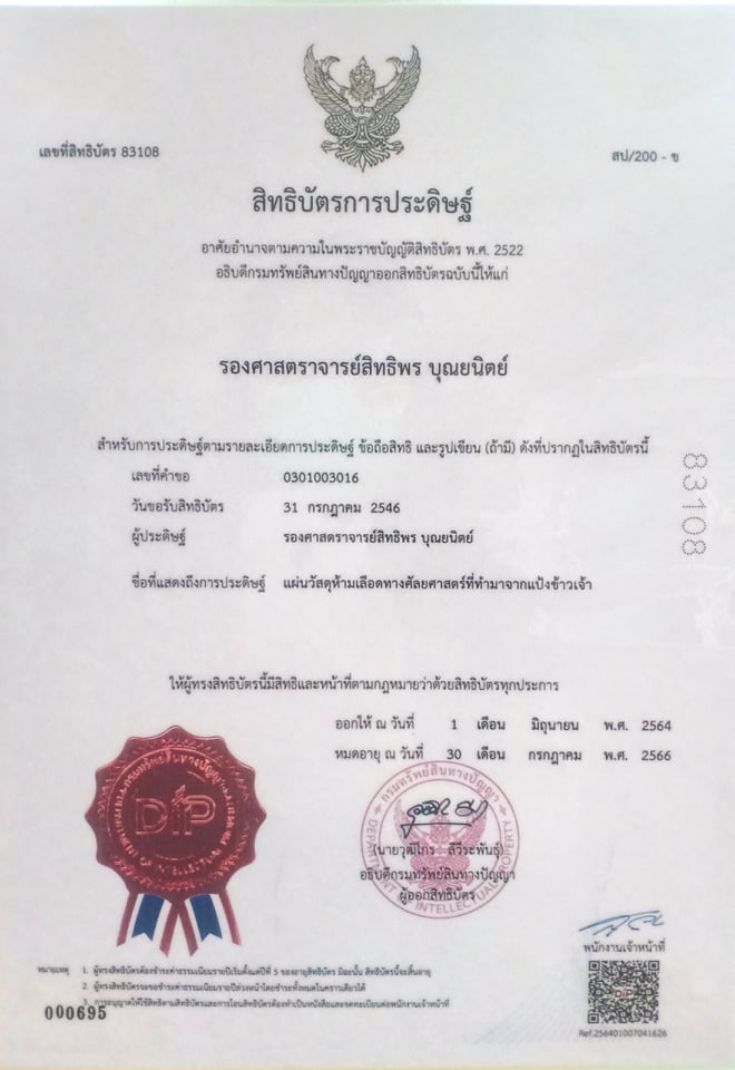 นายแพทย์สิทธิพร บุณยนิตย์ หัวหน้าโครงการวิจัย อาจารย์ สำนักวิชาแพทยศาสตร์ หัวหน้ากลุ่มวิจัยนวัตกรรมชีววัสดุและเครื่องมือแพทย์ มหาวิทยาลัยแม่ฟ้าหลวง จังหวัดเชียงราย ได้ทำการวิจัยพัฒนาการประดิษฐ์นวัตกรรมเครื่องมือแพทย์จากวัตถุดิบเกษตรไทย โดยเลือกข้าวเจ้า และกระดูกสัตว์ มาประดิษฐ์คิดค้นสร้างสรรค์เป็นเครื่องมือแพทย์ ที่ได้มาตรฐานตามกำหนดขององค์กรผลิตเครื่องมือแพทย์นานาชาติ