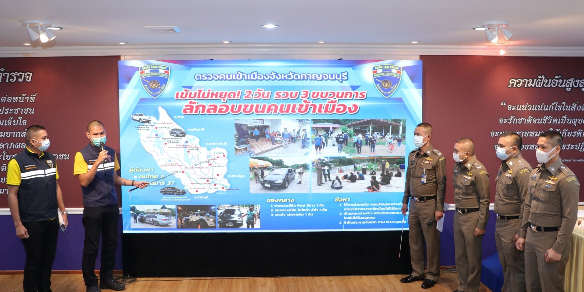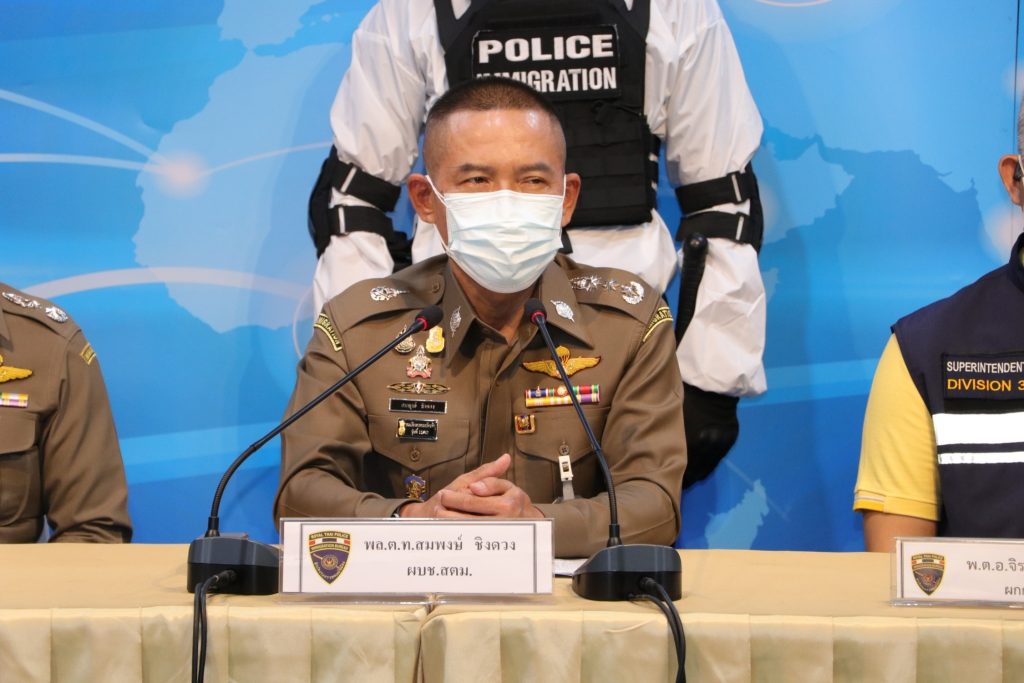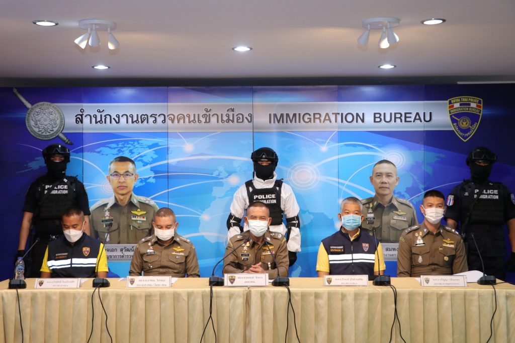 วันที่ 9 ก.ค.64 เวลา 10.30 น.ณ ห้องอเนกประสงค์ ชั้น 1 อาคาร 1 สตม.ซ.สวนพลู แขวงทุ่งมหาเมฆ เขตสาทร กรุงเทพมหานคร : พล.ต.ท.สมพงษ์ ชิงดวง ผบช.สตม.พร้อมด้วย พล.ต.ต.อาชยน ไกรทอง รอง ผบช.สตม.,พล.ต.ต.รุ่งโรจน์ ฐากูรปุณยสิริ ผบก.ตม.3,พ.ต.อ.ทรงโปรด สิริสุขะ,พ.ต.อ.กฤตัชญ์ บำรุงรัตนยศ,พ.ต.อ.รัชธพงศ์ เตี้ยสุด,พ.ต.อ.หฤษฎ์ เอกอุรุ รอง ผบก.ตม.3,ว่าที่ พ.ต.อ.จิรพงศ์ รุจิรดำรงค์ชัย ผกก.สส.บก.ตม.3 และ พ.ต.อ.จักษ์ ยังให้ผล ผกก.ตม.จ.กาญจนบุรี ร่วมแถลงข่าวการจับกุม ดังนี้