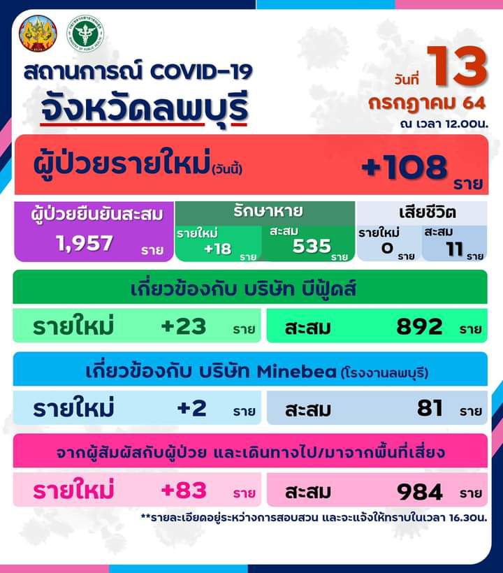สำหรับสถานการณ์โควิด-19 ของจังหวัดลพบุรีวันนี้ มีผู้ป่วยเพิ่ม108 ราย เป็นผู้ป่วยที่เกี่ยวข้องกับบริษัทบีฟู้ดส์ฯ 23 ราย สะสม 892 ราย เกี่ยวข้องกับบริษัทมินิแบ (โรงงานลพบุรี) 2 ราย สะสม 81 ราย เป็นผู้สัมผัสกับผู้ป่วยและผู้ที่เดินทางไป/มาจากพื้นที่เสี่ยง 83 ราย สะสม 984 ราย ขณะนี้มีผู้ป่วยยืนยันสะสม 1,957 ราย รักษาหายวันนี้ 18 ราย รักษาหายสะสม 535 ราย