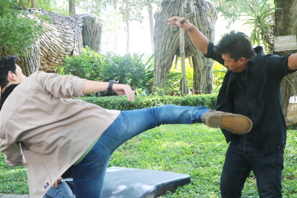 จากนั้นผู้กำกับฯ ขอถ่ายคัทสำคัญ ในช่วงที่กำลังบู๊กันนั้น หนึ่งในสมุนของเทิดไท ก็หยิบมีดขึ้นมาและเข้าต่อสู้อย่างดุเดือดกับ วีรุทธ์ แต่ วีรุทธ์ พลาด ถูกแทงเข้าที่แขน!!!