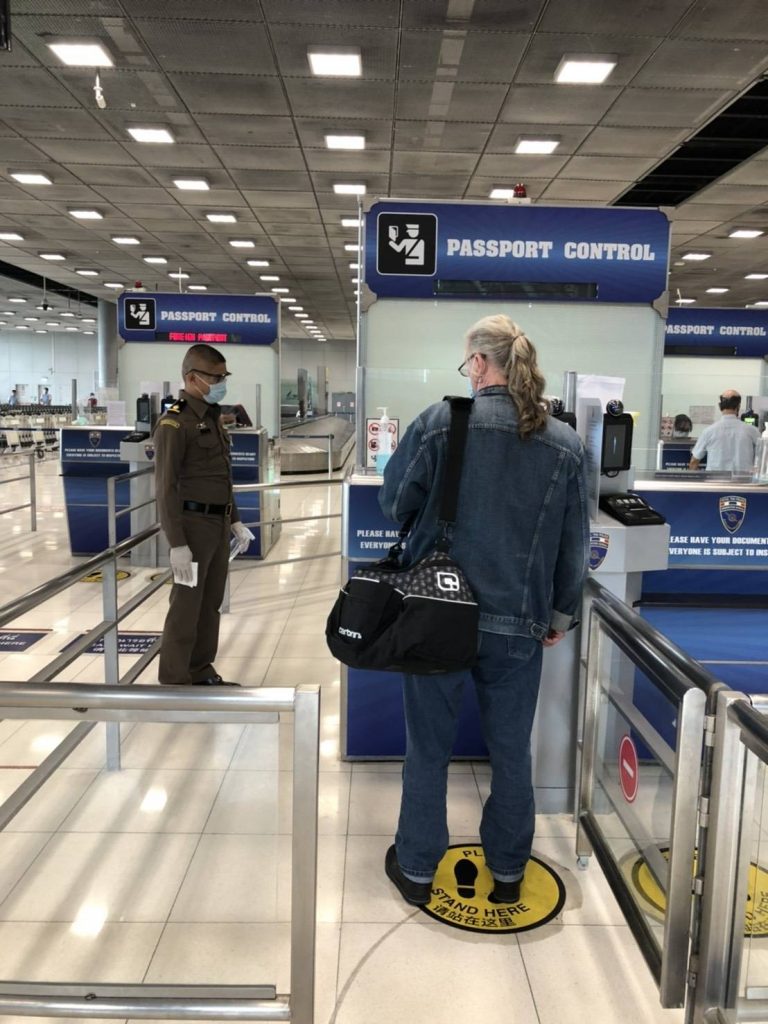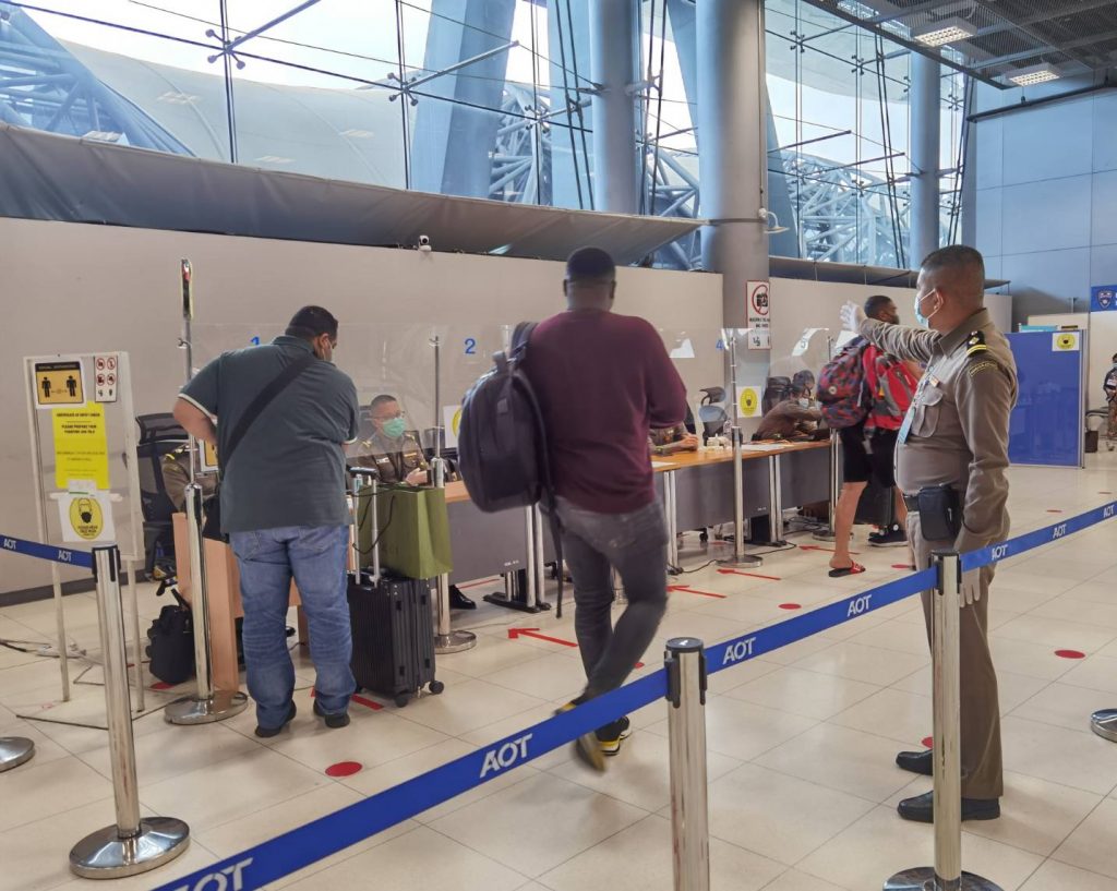 การตรวจผู้โดยสาร มีการจัดระยะห่างของช่องตรวจหนังสือเดินทาง แบบ Physical Distancing โดยมี เจ้าหน้าที่ (ตม.) คอยใช้น้ำยาฆ่าเชื้อเช็ดทำความสะอาดช่องตรวจ และแป้นสแกนลายนิ้วมือทุกครั้ง ก่อนและหลังตรวจผู้โดยสาร โดยเจ้าหน้าที่จะสวมหน้ากากอนามัย และ face shield พร้อมถุงมือที่ทาง (สตม.) สนับสนุนจัดหาให้ทุกราย