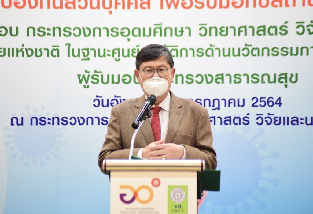 เมื่อวันที่ 13 ก.ค.64 : ศ.ดร.เอนก เหล่าธรรมทัศน์ รมว.อุดมศึกษา วิทยาศาสตร์ วิจัยและนวัตกรรม (อว.) เป็นประธานส่งมอบนวัตกรรมชุดหน้ากากป้องกันเชื้อโรคแบบคลุมศีรษะพร้อมชุดกรองอากาศประสิทธิภาพสูง (PAPR) และอุปกรณ์ป้องกันส่วนบุคคล ให้กับกระทรวงสาธารณสุข (สธ.) เพื่อรับมือสถานการณ์โควิด-19 โดยมี นพ.สุระ วิเศษศักดิ์ รองปลัด (สธ.) เป็นผู้รับมอบ