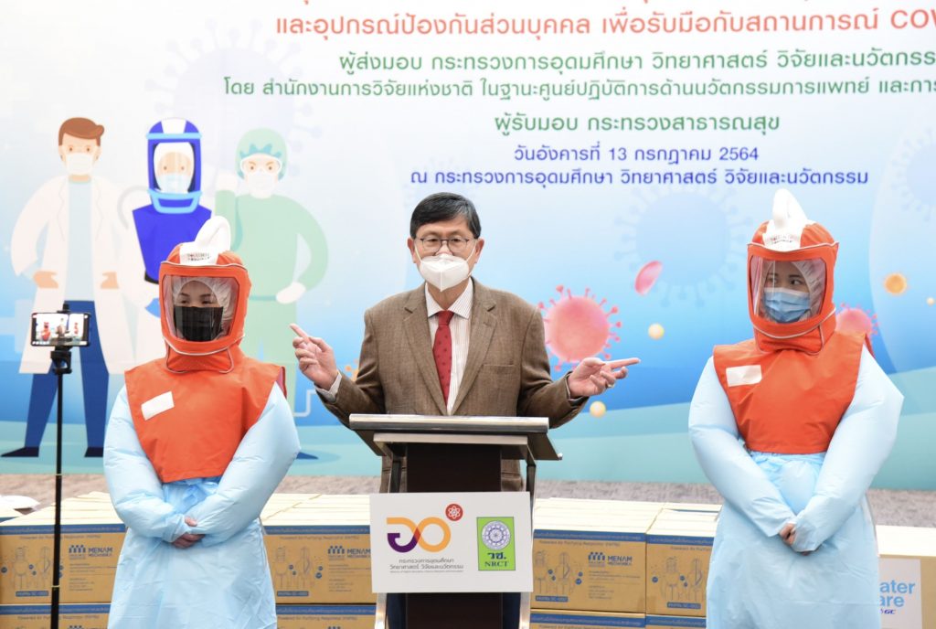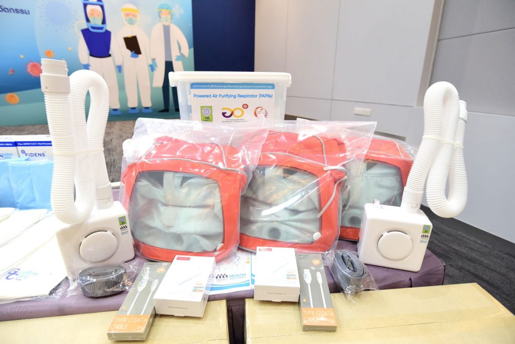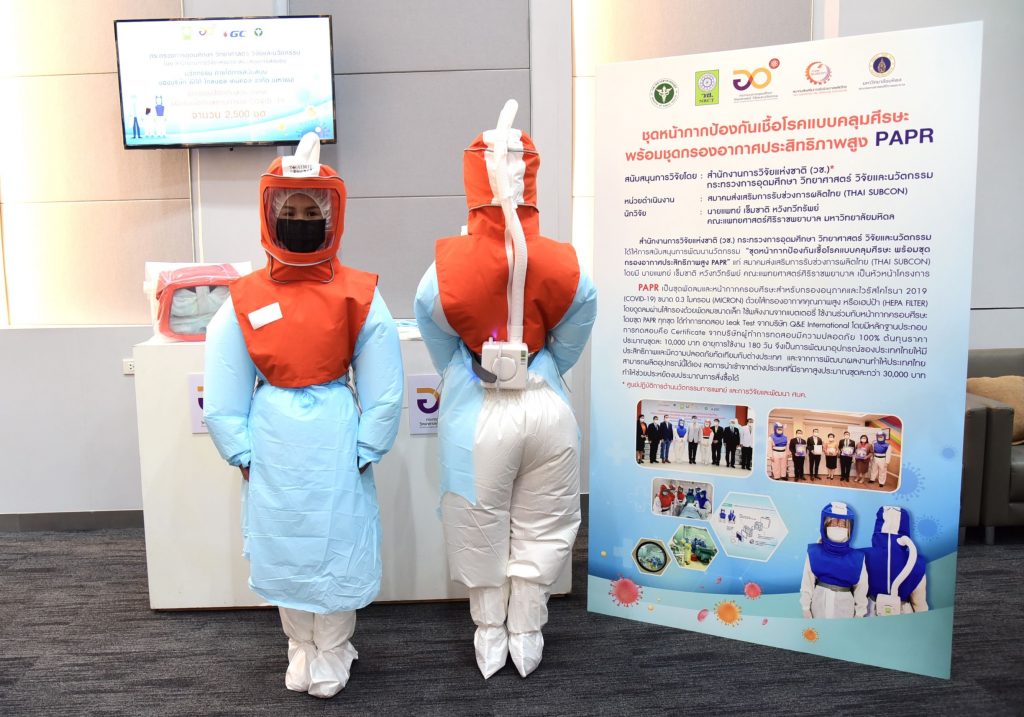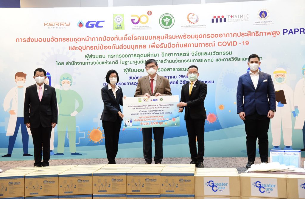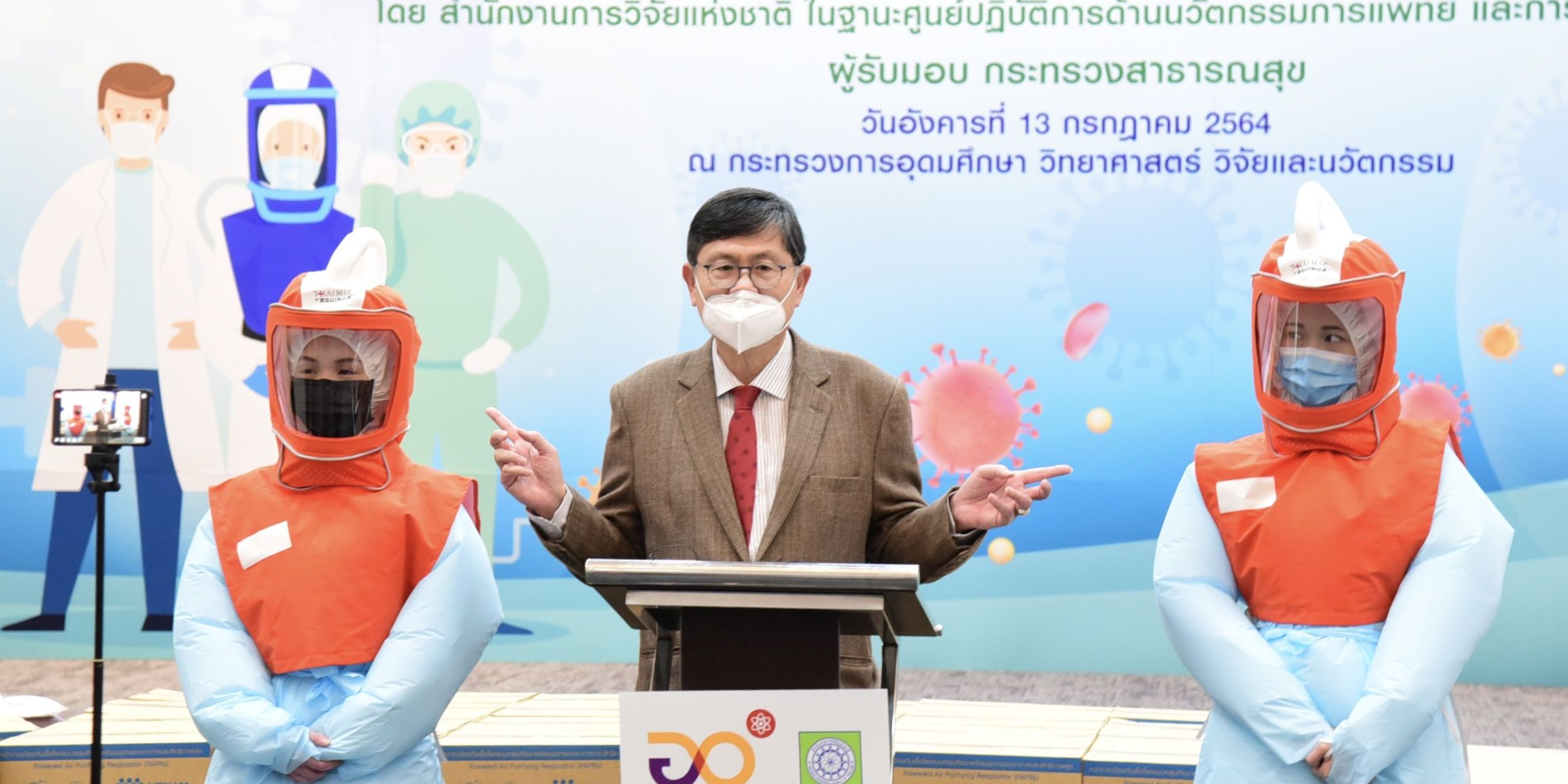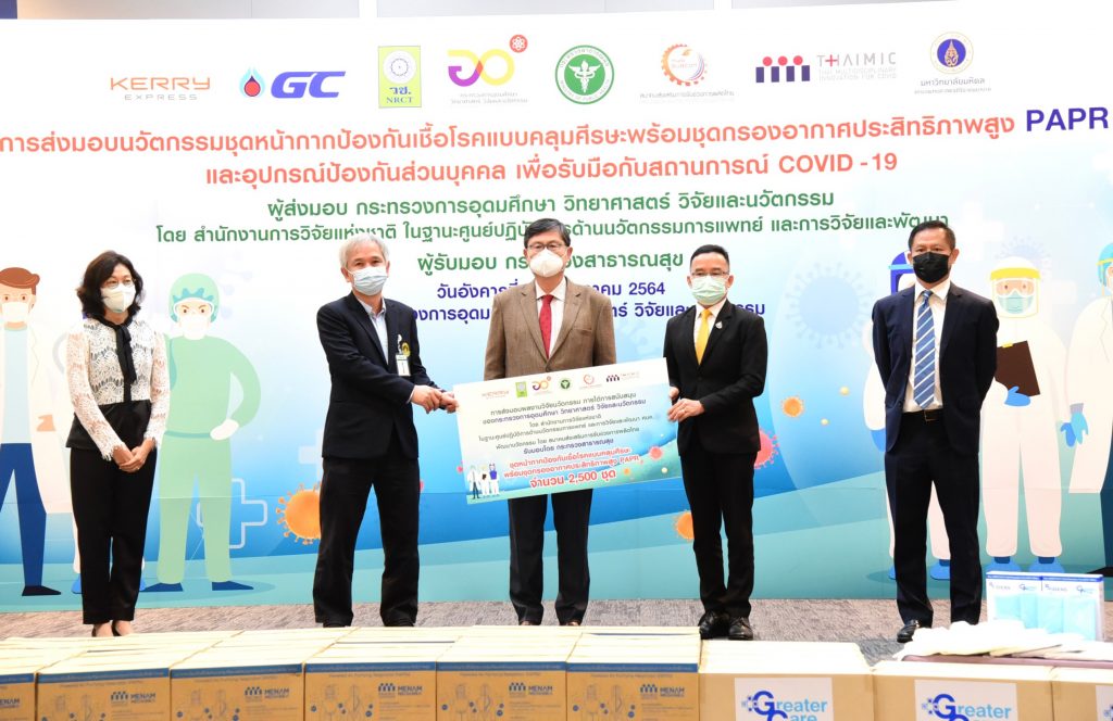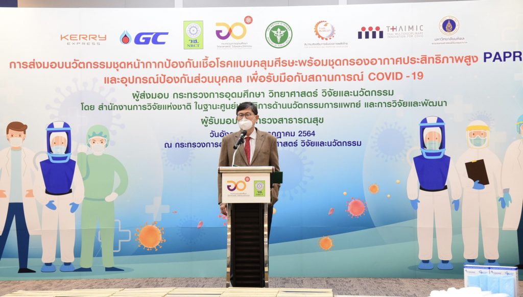 ด้าน ดร.วิภารัตน์ ดีอ่อง ผอ.สำนักงานการวิจัยแห่งชาติ (วช.) กล่าวว่า (สธ.) ได้มีหนังสือขอรับการสนับสนุนนวัตกรรมชุดหน้ากากป้องกันเชื้อโรคแบบคลุมศีรษะชุดกรองอากาศประสิทธิภาพสูง (PAPR) และอุปกรณ์ป้องกันส่วนบุคคล มายัง (วช.) ในฐานะศูนย์ปฏิบัติการด้านนวัตกรรมการแพทย์ และการวิจัยและพัฒนา (วช.) จึงสนับสนุนนวัตกรรมชุด (PAPR) จากสมาคมส่งเสริมการรับช่วงการผลิตไทยจำนวน 2,500 ชุดและบริษัท พี ทีที โกลบอล เคมิคอล จำกัด (มหาชน) มอบชุดกาวน์กันน้ำ จำนวน 2,500 ชุด และชุด Coverall จำนวน 100 ชุด โดยมี บริษัทผู้นำธุรกิจด้านการจัดส่งพัสดุด่วนทั่วไทยอย่าง เคอรี่ เอ็กซ์เพรส (ประเทศไทย) จำกัด (มหาชน) ให้การสนับสนุนจัดส่งฟรีทั้งหมด โดยไม่คิดค่าใช้จ่าย เพื่อช่วยให้แพทย์ พยาบาล รวมไปถึงเจ้าหน้าที่ ที่อยู่ด่านหน้าจะได้รับชุดอย่างเร็วที่สุด ตรงตามความต้องการ และเกิดประโยชน์สูงสุด นอกจากนี้ ยังได้รับความร่วมมือจากกลุ่มสหศาสตร์นวัตกรรมไทยต้านภัยโควิด หรือ ThaiMic ในการกำหนดโรงพยาบาล และจำนวนอุปกรณ์ อีกด้วย