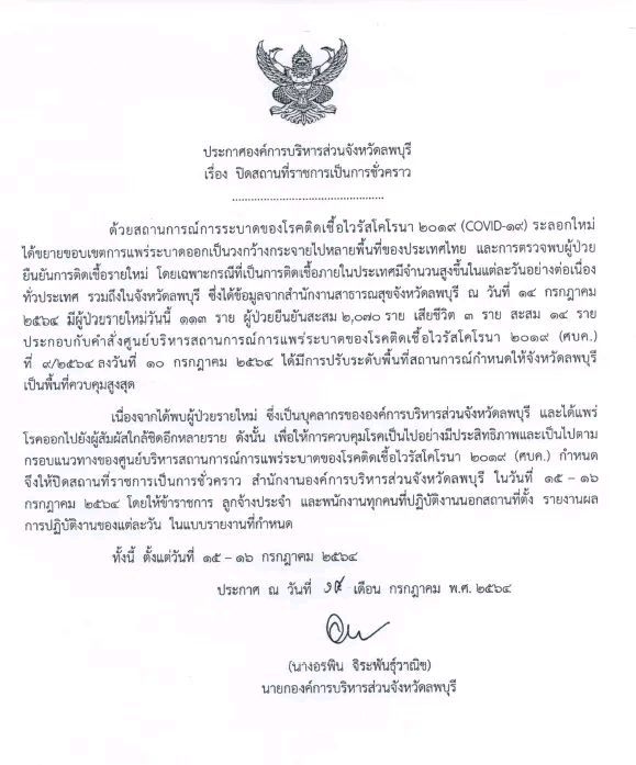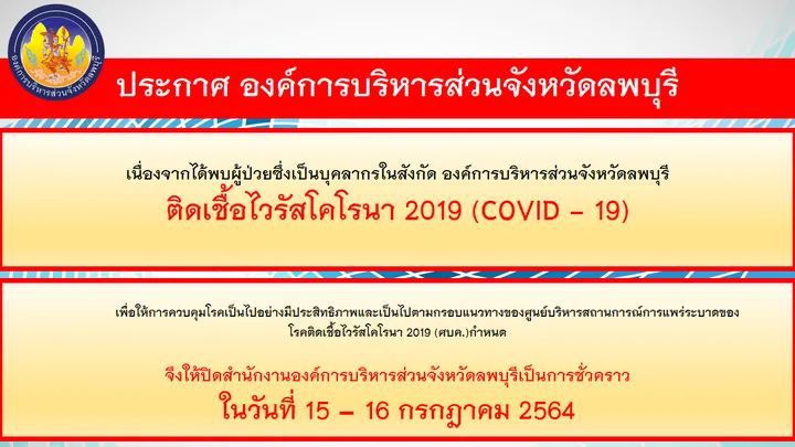 องค์การบริหารส่วนจังหวัดลพบุรี ได้สั่งปิดสำนักงานฯ เป็นเวลา 2 วัน ซึ่งจะมีการล้างความสะอาดฆ่าเชื้อโควิด 19ในบริเวณ องค์การบริหารส่วนจังหวัดฯ เป็นเวลา 2 วัน