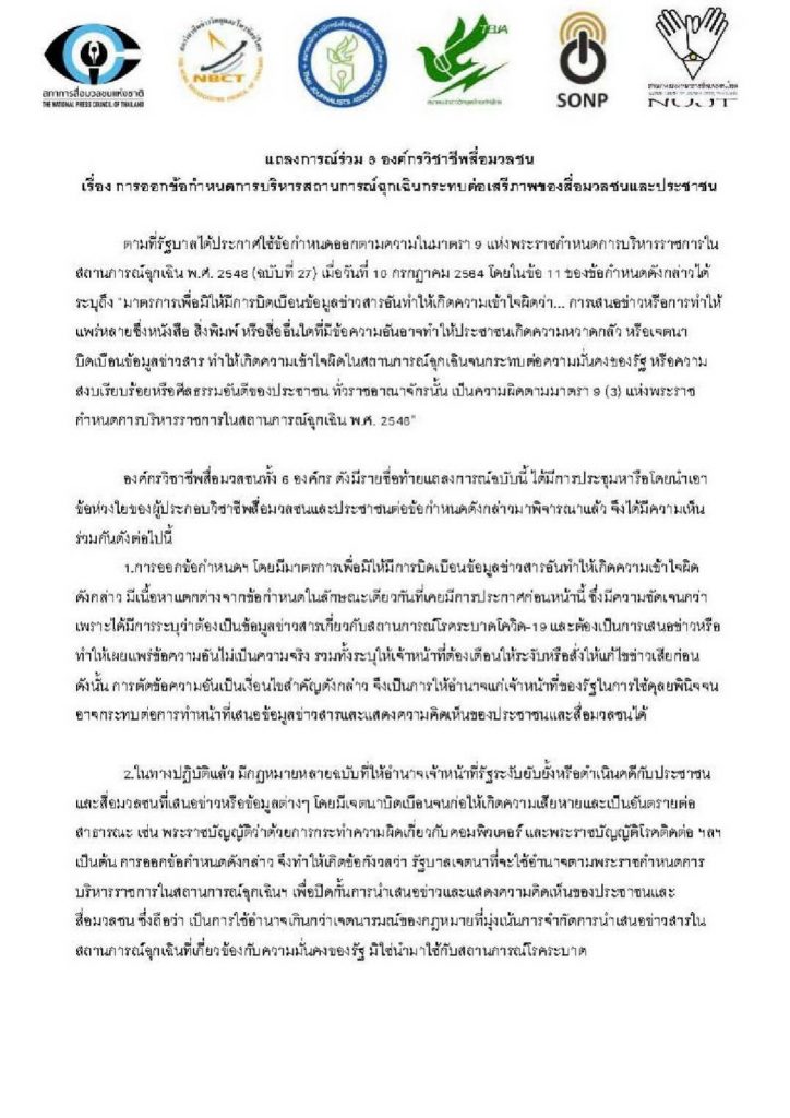 เมื่อวันที่ 15 ก.ค.64 เวลา 15.08 น.แถลงการณ์ร่วม 6 องค์กรวิชาชีพสื่อมวลชน แสดงพลังค้าน พ.ร.ก.ปิดปากสื่อ หรือ “ข้อกำหนดการบริหารสถานการณ์ฉุกเฉิน” กระทบต่อเสรีภาพของสื่อมวลชนและประชาชน จี้ ศบค.-รัฐบาลทบทวน โดย มีการออกแถลงการณ์ของ 6 องค์กรวิชาชีพสื่อมวลชน ประกอบด้วย สภาการสื่อมวลชนแห่งชาติ,สภาวิชาชีพข่าววิทยุและโทรทัศน์ไทย,สมาคมนักข่าวนักหนังสือพิมพ์แห่งประเทศไทย,สมาคมนักข่าววิทยุและโทรทัศน์ไทย,สมาคมผู้ผลิตข่าวออนไลน์ และ สหภาพแรงงานกลางสื่อมวลชนไทย