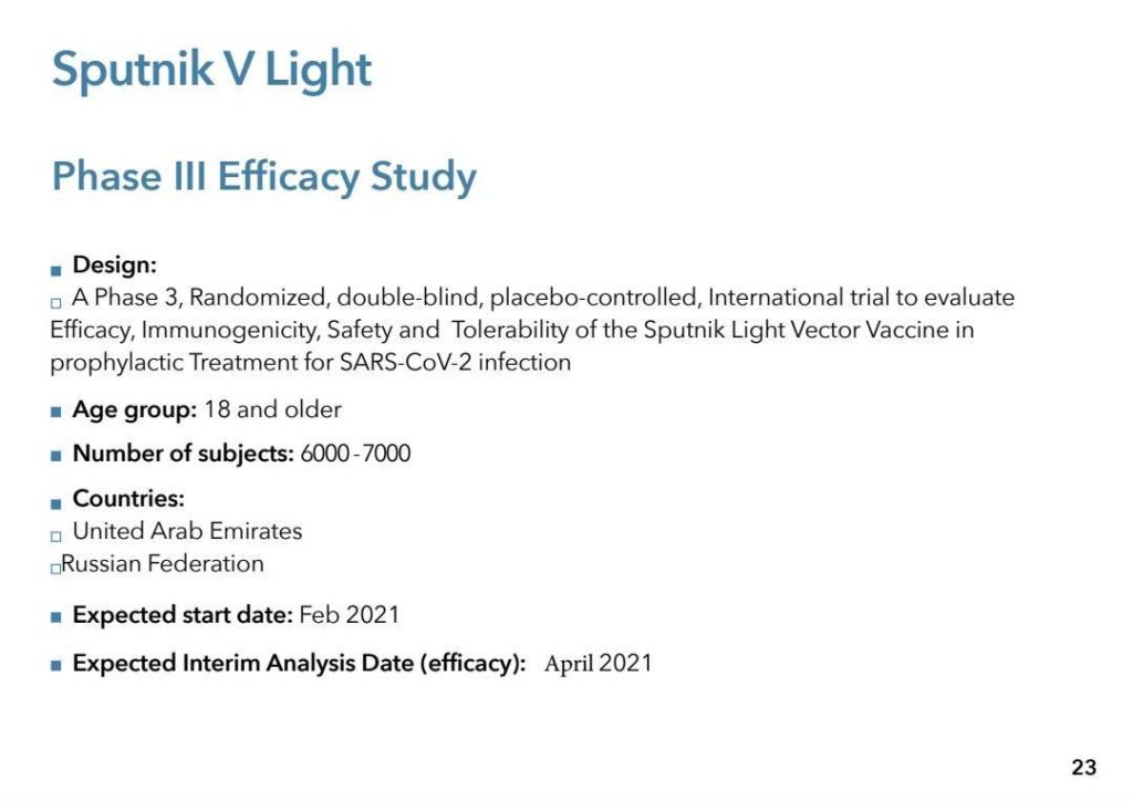 “ข่าวสารจากหลายประเทศแจ้งว่า การอนุมัติการใช้วัคซีน “สปุตนิก ไลท์” ระบุ ถึงผลวิจัยด้านประสิทธิภาพในการป้องกันไวรัสโควิด-19 ในการฉีดเพียงเข็มเดียว มากกว่า 90% และ มีความแตกต่างจาก “สปุตนิก-วี” (Sputnik-V) ซึ่งต้องฉีด 2 เข็ม ซึ่งจะทำให้เกิดการสร้างภูมิคุ้มกันหมู่ได้อย่างรวดเร็ว ประหยัด สะดวกมากกว่าเดิม เพราะในระยะเวลาที่ได้รับวัคซีนเข็มแรกถึงเข็มที่ 2 ยังคงเป็นระยะทีมีความไม่แน่นอน และยังมีโอกาสเสี่ยง ในการได้รับเชื้ออยู่ ดังนั้นตนเชื่อว่าวัคซีนชนิดฉีด เพียงครั้งเดียวคือ Sputnik Light และ วัคซีน Novavac นั้นประสิทธิภาพและระยะเวลาการ สร้างภูมิคุ้มกันหมู่ที่รวดเร็วยิ่งขึ้นอย่างแน่นอน เป็นอีกหนึ่งวัคซีนทางเลือกที่สามารถลดความสูญเสีย ในการติดเชื้อ โควิด- 19 หรือเสียชีวิต จากความรุนแรงของโรคอย่างเฉียบพลัน