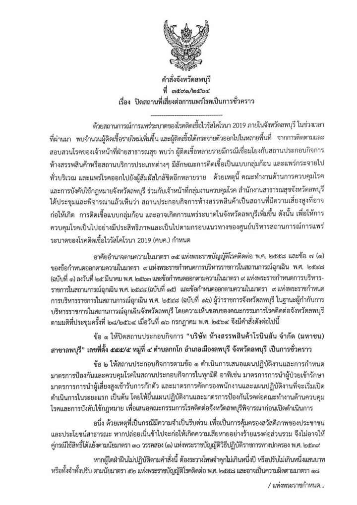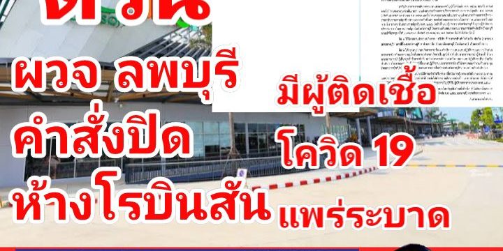 ศูนย์ข้อมูล โควิด19 จังหวัดลพบุรีเปิดเผยว่า นายนิวัฒน์ รุ่งสาคร ผู้ว่าราชการจังหวัดลพบุรี ในฐานะประธานคณะกรรมการโรคติดต่อจังหวัดลพบุรีมีคำสั่งจังหวัดลพบุรี คำสั่งจังหวัดลพบุรี ที่ 3591/2564 เรื่อง ปิดสถานที่เสี่ยงต่อการแพร่โรคเป็นการชั่วคราว ลงวันที่ 16 กรกฎาคม 2564 (บริษัท ห้างสรรพสินค้าโรบินสัน จำกัด (มหาชน) สาขาลพบุรี) ซึ่งมีคำสั่งด่วนสุด ให้ทางห้างปฏิบัติตามคำสั่งขอสั่งปิดห้างตั้งแต่วันที่ 17 ถึง 19 กรกฎาคม 2564เป็นเวลา 3 วัน สืบเนื่องมาจากมีผู้ติดเชื้อโควิค 19เป็นผู้สัมผัสกับผู้ป่วยเสียงสูง ห้างโรบินสันสาขาลพบุรี มียอดผู้ป่วยจำนวน 14 ราย