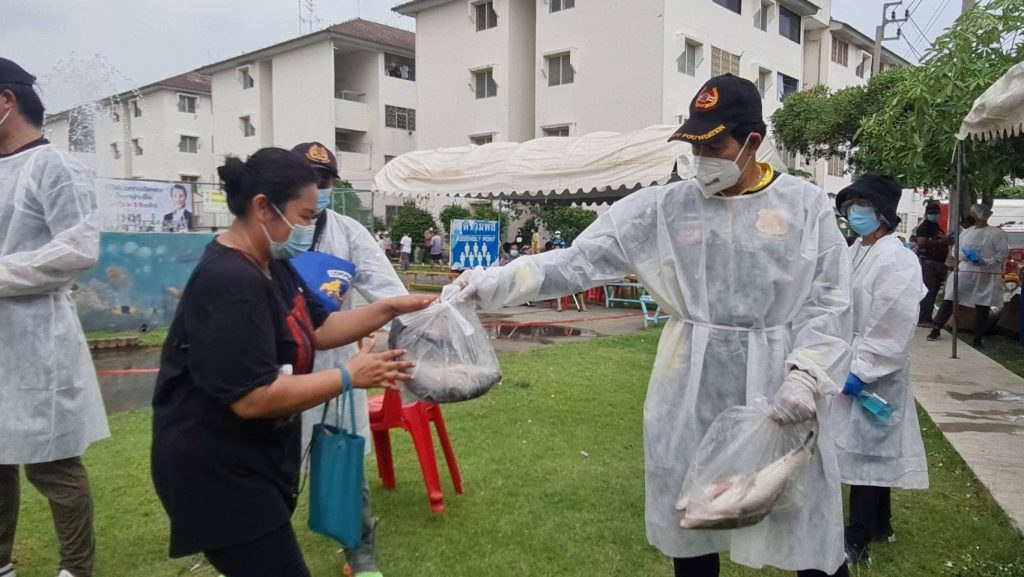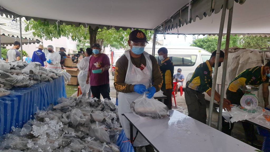จากนั้น บิณฑ์ บรรลือฤทธิ์ พร้อมทีม มูลนิธิร่วมกตัญญู ได้นำปลากระพง ใส่รถกะบะ มาขายให้ประชาชน ที่การเคะหะเอื้ออาทรร่มเกล้า แขวงคลองสองต้นนุ่น เขตลาดกระบัง กทม.