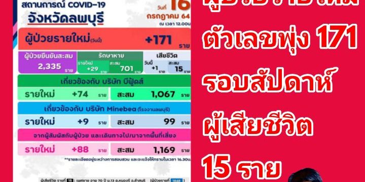สถานการณ์การแพร่ระบาดเชื้อไวรัสโควิช 19 ในจังหวัดลพบุรี ในรอบสัปดาห์ตัวเลขผู้ป่วยรายใหม่พุ่งถึง 171 ราย ผู้เสียชีวิต รายที่ 15 เป็นชายผู้สูงอายุวัย 70 ปี อยู่ที่ตำบลหนองรี อำเภอลำสนธิ จังหวัดลพบุรี