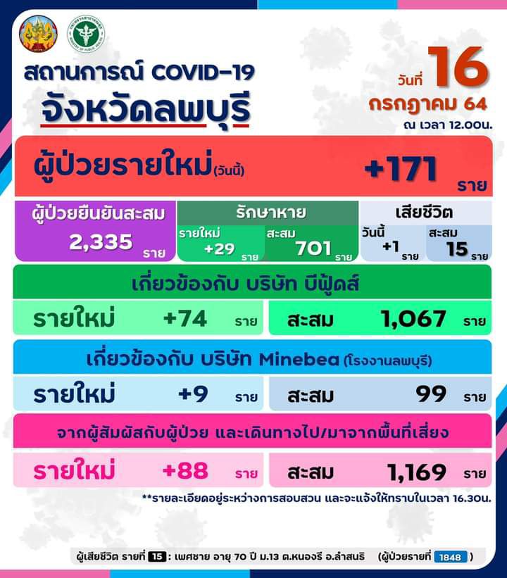 ล่าสุด ทางด้าน ศูนย์ปฏิบัติการตอบโต้ภาวะฉุกเฉิน สำนักงานสาธารณสุขจังหวัดลพบุรี ได้รายงานสถานการณ์ การระบาดของโรคติดเชื้อไวรัสโคโรนา 2019 (โควิด-19) จังหวัดลพบุรี (ระลอกการระบาดเดือนเมษายน) ประจำวันนี้ (16 กรกฎาคม 2564) จังหวัดลพบุรีพบผู้ป่วยเพิ่ม 171ราย เป็นผู้ที่เกี่ยวข้องกับ บริษัท บีฟู้ดส์ฯ จำนวน 74 ราย (สะสม 1,067ราย) เกี่ยวข้องกับบริษัทมินิแบ (โรงงานลพบุรี) จำนวน +9 ราย (สะสม 99 ราย) และเป็นผู้สัมผัสกับผู้ป่วยและเดินทางไป/มาจากพื้นที่เสี่ยงสูง จำนวน +88 ราย (สะสม 1,169ราย) โดยมีจำนวนผู้ป่วยสะสม 2164 ราย รักษาหายแล้ว 701ราย วันนี้มีรายงานผู้เสียชีวิตเพิ่ม +1 รายใหม่ รายที่ 15เป็นเพศชายอายุ 70 ปี หมู่ 13 ตำบลหนองรี อำเภอลำสนธิ ของจังหวัดลพบุรี./