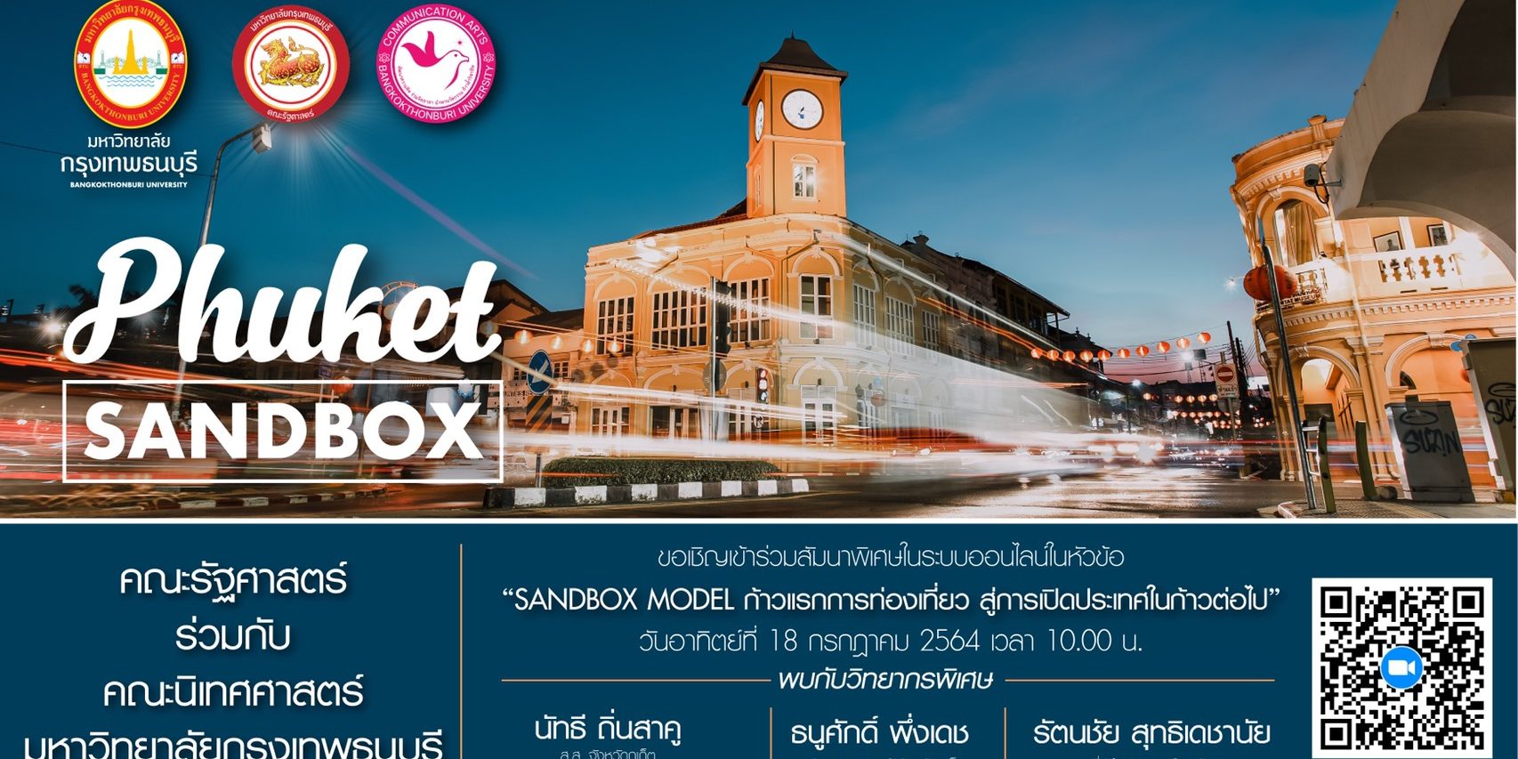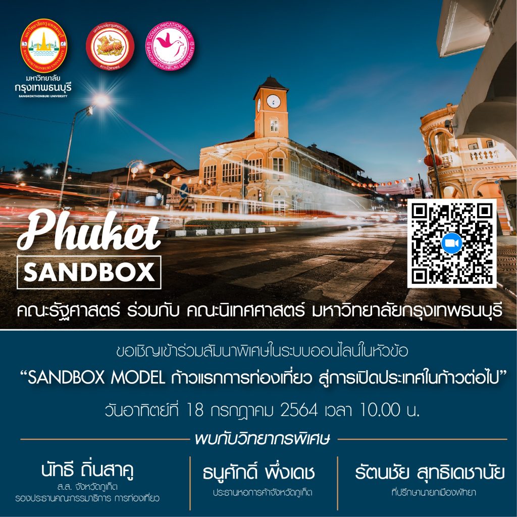 คณะรัฐศาสตร์ ร่วมกับ คณะนิเทศศาสตร์ มหาวิทยาลัยกรุงเทพธนบุรี ร่วมกันจัดสัมมนาพิเศษในระบบออนไลน์ (ZOOM) ในหัวข้อ “SANDBOX MODEL ก้าวแรกการท่องเที่ยว สู่การเปิดประเทศในก้าวต่อไป” โดยวิทยากรผู้ทรงคุณวุฒิ คุณนัทธี ถิ่นสาคู สมาชิกสภาผู้แทนราษฎร จังหวัดภูเก็ต และ รองประธานคณะกรรมาธิการ การท่องเที่ยว, คุณธนูศักดิ์ พึ่งเดช ประธานหอการค้าจังหวัดภูเก็ต และคุณรัตนชัย สุทธิเดชานัย ที่ปรึกษานายกเมืองพัทยา ดำเนินรายการโดย รศ.ดร.กมลพร กัลยาณมิตร คณบดีคณะรัฐศาสตร์ และ รศ.ดร.สุกัญญา บูรณเดชาชัย คณบดีคณะนิเทศศาสตร์ มหาวิทยาลัยกรุงเทพธนบุรี โดยมี ธนภณ โอภาสธัญกร (ต้อม นิรันดร์) และ แอปเปิ้ล-กิรษา หอมเสียง เป็นพิธีกร ในวันอาทิตย์ที่ 18 กรกฎาคม 2564 ตั้งแต่เวลา 10.00 น. เป็นต้นไป