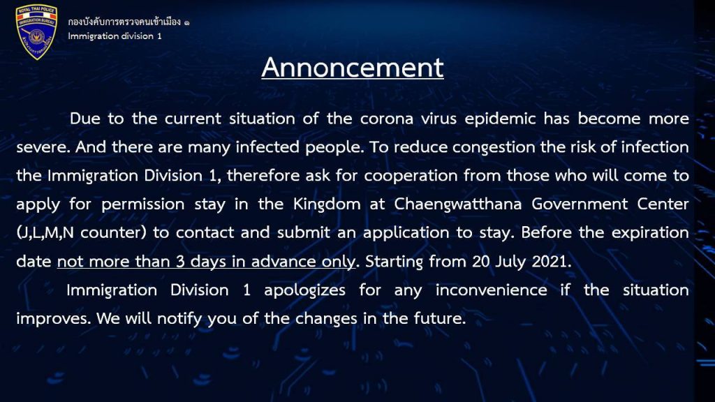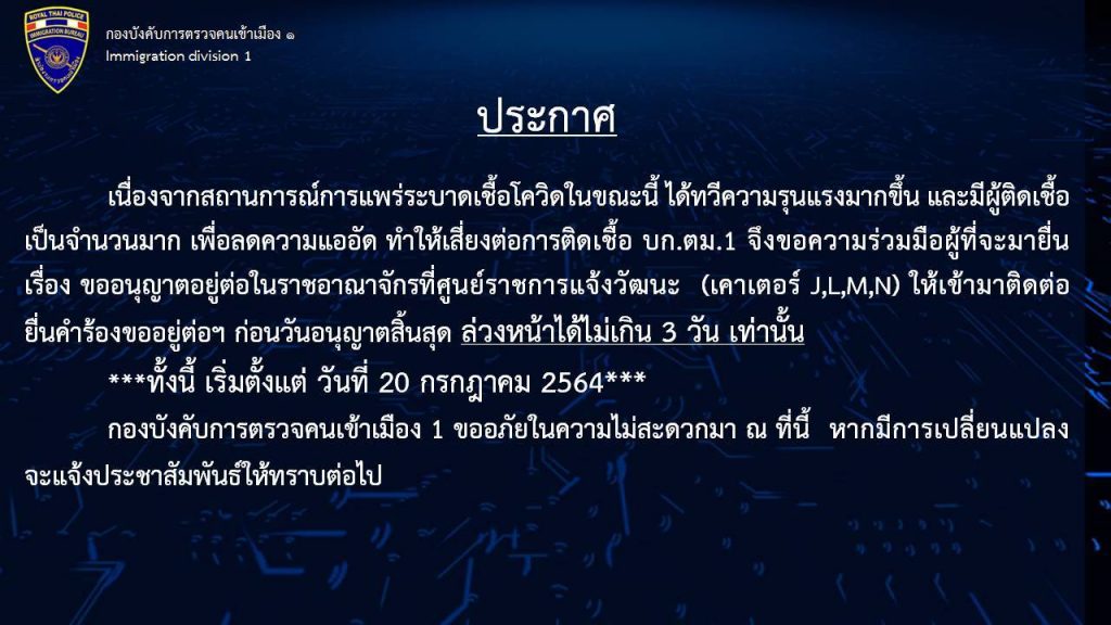 เพื่อลดความแออัด ทำให้เสี่ยงต่อการติดเชื้อ บก.ตม.1 จึงขอความร่วมมือผู้ที่จะมายื่นเรื่องขออนุญาตอยู่ต่อในราชอาณาจักรที่ศูนย์ราชการแจ้งวัฒนะ (เคาเตอร์ J,L,M,N)