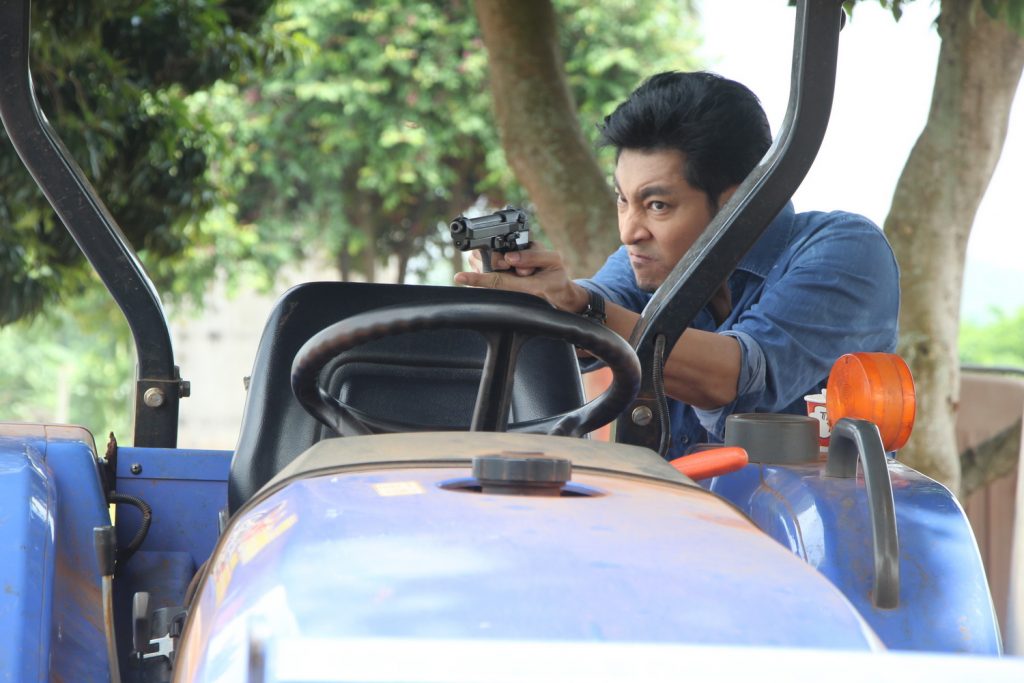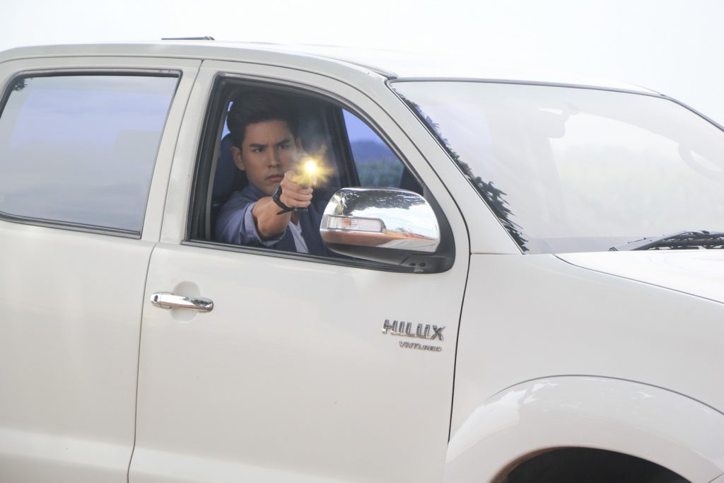 ฉากนี้มีเอฟเฟ็กต์เข้าร่วมด้วย ทางผู้กำกับฯ จารึก สงวนพงษ์ จึงขอซักซ้อมคิวนักแสดงเสียก่อน ทั้งคิวยิงของ จุ๊บ และคิวของ หนุ่มอั๋น ที่ต้องขับรถเข้าเฟรมพร้อมปืนในมือ