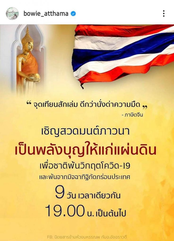 เนื่องในวันอาสหฬบูชา และเข้าพรรษา ดาราสาวใจบุญ “โบวี่ อัฐมา” รีโพส ภาพเชิญชวนจากธรรมสถานที่ตนปฏิบัติอยู่ เนื้อความระบุ ชวนคนไทยร่วม สวดมนต์-นั่งสมาธิ 9 วันติด เพื่ออุทิศบุญให้ประเทศชาติ โดยสาว “โบวี่” ก็ร่วมปฏิบัติด้วย ทุกรอบ ทั้ง 9 วัน เช่นกัน