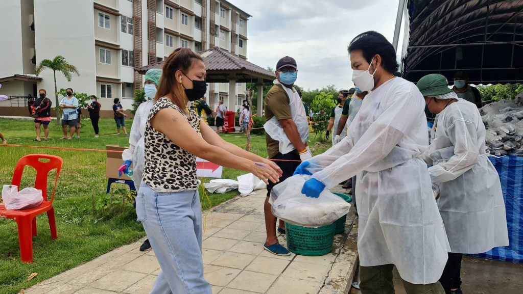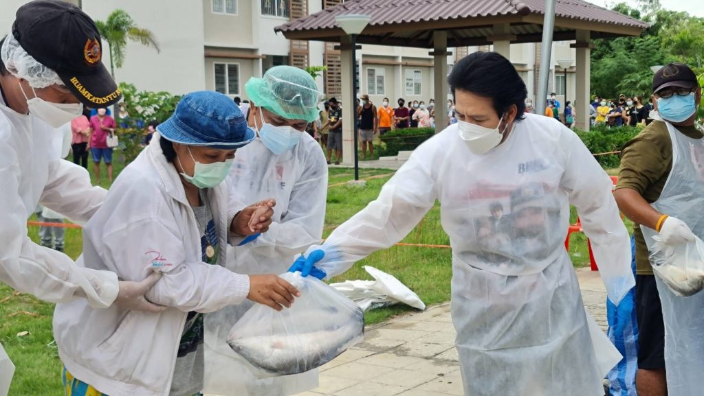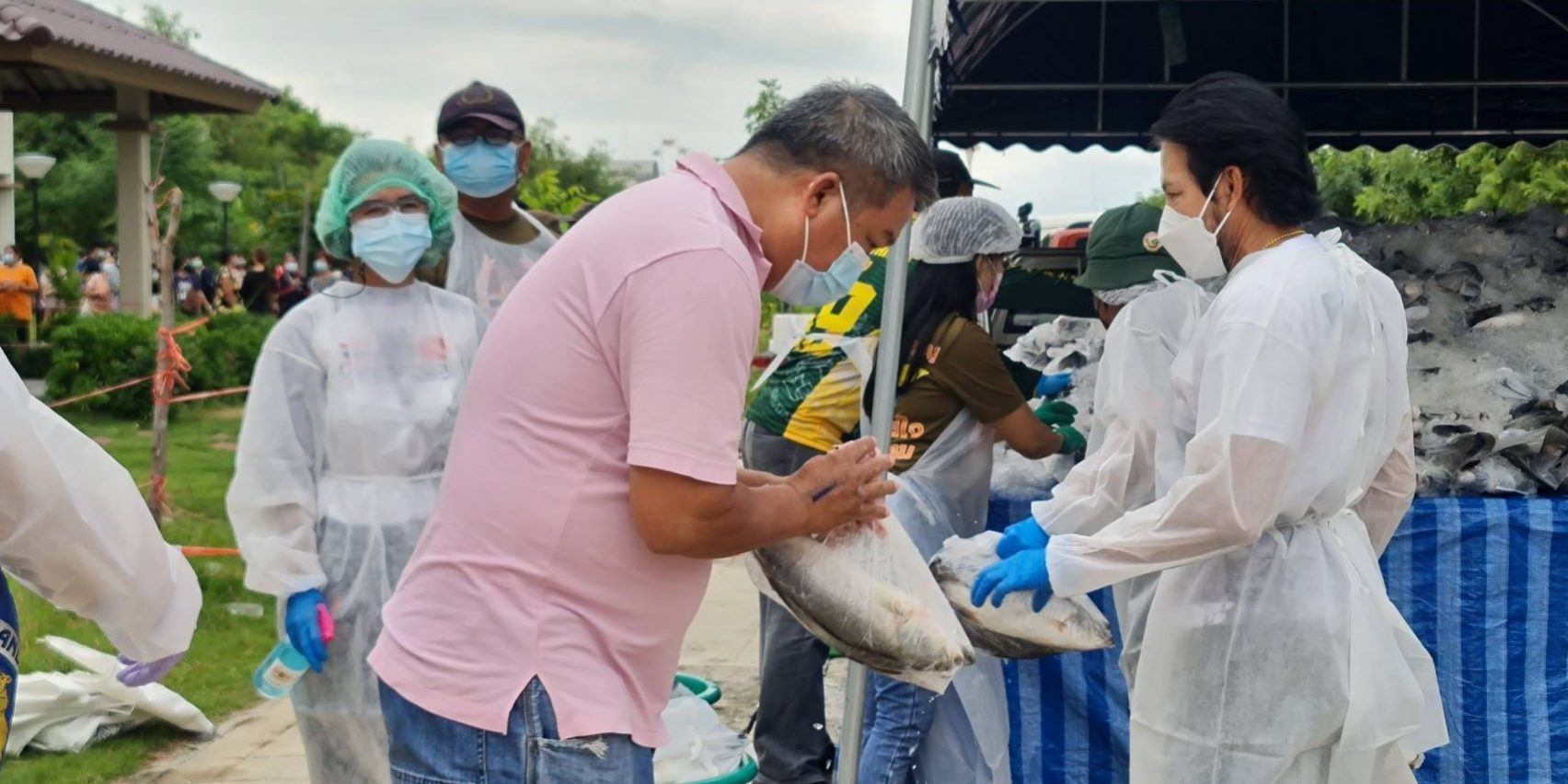 จากนั้น บิณฑ์ บรรลือฤทธิ์ พร้อมทีม มูลนิธิร่วมกตัญญู นำปลากระพง ใส่รถกะบะ นำมา ขายให้ประชาชน อีกครั้งที่ การเคหะเอื้ออาทร ลาดกระบัง 2 แขวงทับยาว เขตลาดกระบัง กทม.