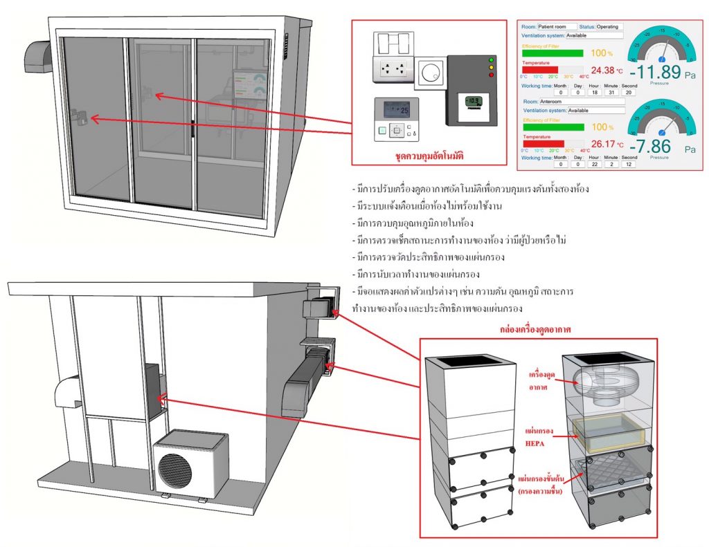 ดร.วิภารัตน์ ดีอ่อง ผู้อำนวยการสำนักงานการวิจัยแห่งชาติ (วช.) กล่าวว่า ในสถานการณ์การแพร่ระบาดของโรคติดเชื้อไวรัสโคโรนา 2019 หรือโรคโควิด-19 (อว.) โดย (วช.) ได้สนับสนุนทุนวิจัยเพื่อพัฒนา “นวัตกรรมห้อง ICU ความดันลบเคลื่อนที่” เพื่อรับมือกับสถานการณ์การแพร่ระบาดของโรคดังกล่าวที่ทวีความรุนแรงมากยิ่งขึ้น โดยผลสำเร็จจากการพัฒนานวัตกรรมห้อง ICU ความดันลบเคลื่อนที่ ทีมนักวิจัยได้นำไปติดตั้งให้กับโรงพยาบาล,โรงพยาบาลสนามในหลายพื้นที่ของกรุงเทพมหานคร และพื้นที่ปริมณฑล ซึ่งมีความต้องการใช้ห้อง ICU ความดันลบเคลื่อนที่ในการรองรับผู้ป่วยโควิด-19 อย่างสะดวกมากยิ่งขึ้น จากความพร้อมในการใช้งาน จึงได้มีการนำไปใช้ประโยชน์ที่โรงพยาบาลเจริญกรุงประชารักษ์ ซึ่งได้ผลสำเร็จเป็นอย่างดี โดยห้อง ICU ความดันลบเคลื่อนที่นี้ จะสามารถจำกัดวงกว้างในการควบคุมเชื้อโรคให้อยู่ในพื้นที่ที่จำกัดได้ โดยมีขนาด 3×6.5 เมตร/ยูนิต มีห้อง anteroom ในตัว มีระบบควบคุมแรงดันอากาศอัตโนมัติ ทั้งกรณีที่มีการเปิด-ปิดประตูในแต่ละห้อง พร้อมระบบดูดอากาศผ่านเครื่องกรองอากาศฆ่าเชื้อโรค ที่มีประสิทธิภาพสูงในการกรองอนุภาคขนาดเล็กที่อาจมีเชื้อโรคเจือปน เพื่อกรองเชื้อไวรัสและปล่อยออกมาสู่ภายนอกอาคารเป็นอากาศบริสุทธิ์ ในแต่ละยูนิตจะรองรับผู้ป่วยได้ 1 คน และสามารถปรับรูปแบบการใช้งานได้ตามความต้องการ เช่น เป็นห้อง ICU ห้องตรวจ หรือห้องฉุกเฉิน นอกจากนี้ ยังสามารถนำนวัตกรรมนี้ไปใช้งานได้ในสถานการณ์อื่นๆ ได้อีกในอนาคต จากนี้ (วช.) จะดำเนินการติดตั้งต่อไปให้กับโรงพยาบาลที่ได้รับการประสานงาน เพื่อช่วยรับมือกับผู้ป่วยโควิด-19 ที่มีจำนวนเพิ่มมากขึ้นอย่างต่อเนื่อง
