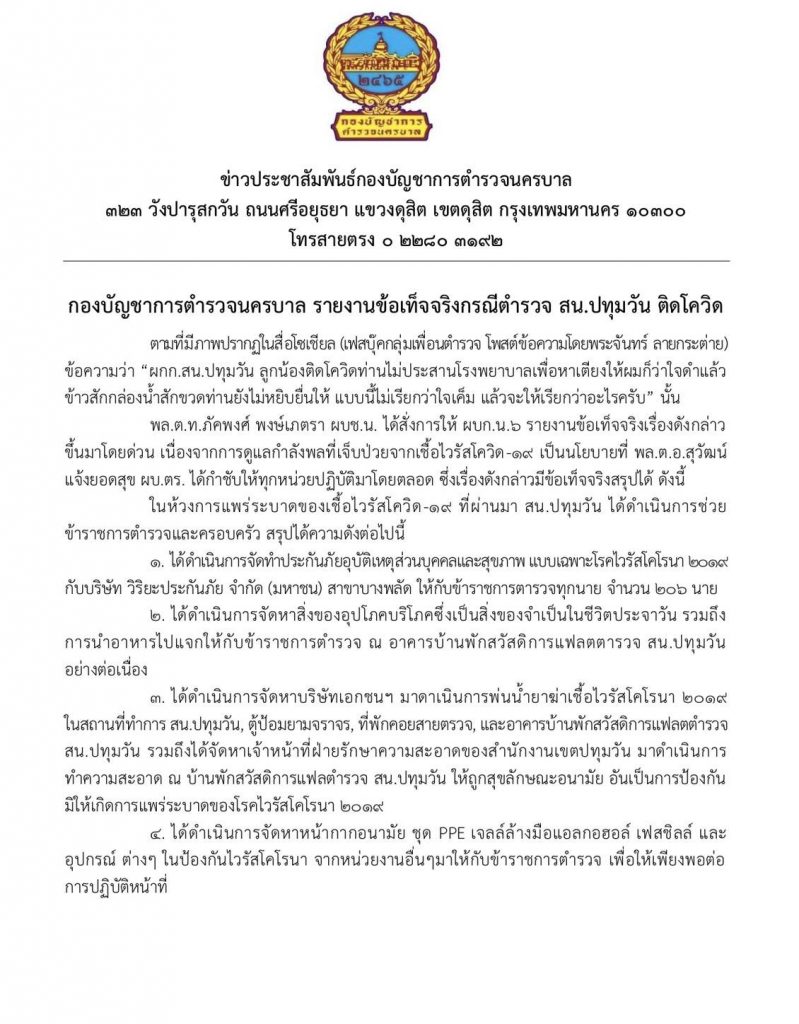 ในส่วนของภาพที่ปรากฏในสื่อโซเชียลนั้น สน.ปทุมวัน ได้ประสานไปยัง สถานพยาบาลต่างๆ ในพื้นที่รับผิดชอบ ในการจัดหาสถานที่รักษาพยาบาล,โรงพยาบาลสนาม,Hospitel หรือสถานที่สถานพยาบาลอื่นๆ เพื่อขอให้ จัดหาสถานพยาบาลรองรับข้าราชการตำรวจและครอบครัวที่ติดเชื้อไวรัสโคโรนา 2019 ในรายที่ถูกกล่าวถึงเข้าทำการรักษาตัวแล้ว แต่เนื่องด้วยสถานการณ์ขณะนี้ยังไม่มีเตียงในการรองรับข้าราชการตำรวจรายดังกล่าวได้ จึงได้สั่งการให้ รอง ผกก.สส.สน.ปทุมวัน ดูแลข้าราชการ ตำรวจรายดังกล่าวอย่างใกล้ชิด ซึ่งต่อมาสำนักงานสาธารณสุข ศูนย์ 5 จุฬาลงกรณ์ได้แนะนำให้ข้าราชการตำรวจรายดังกล่าว เข้าร่วมโครงการ Home Isolation โดยจะมีคณะแพทย์และคณะพยาบาลเข้ามาดูแลรักษาโดยจะนำยารักษา และอาหาร 3 มื้อต่อวัน มาส่งให้จนกว่าจะรักษาตัวหายดีจากการป่วย