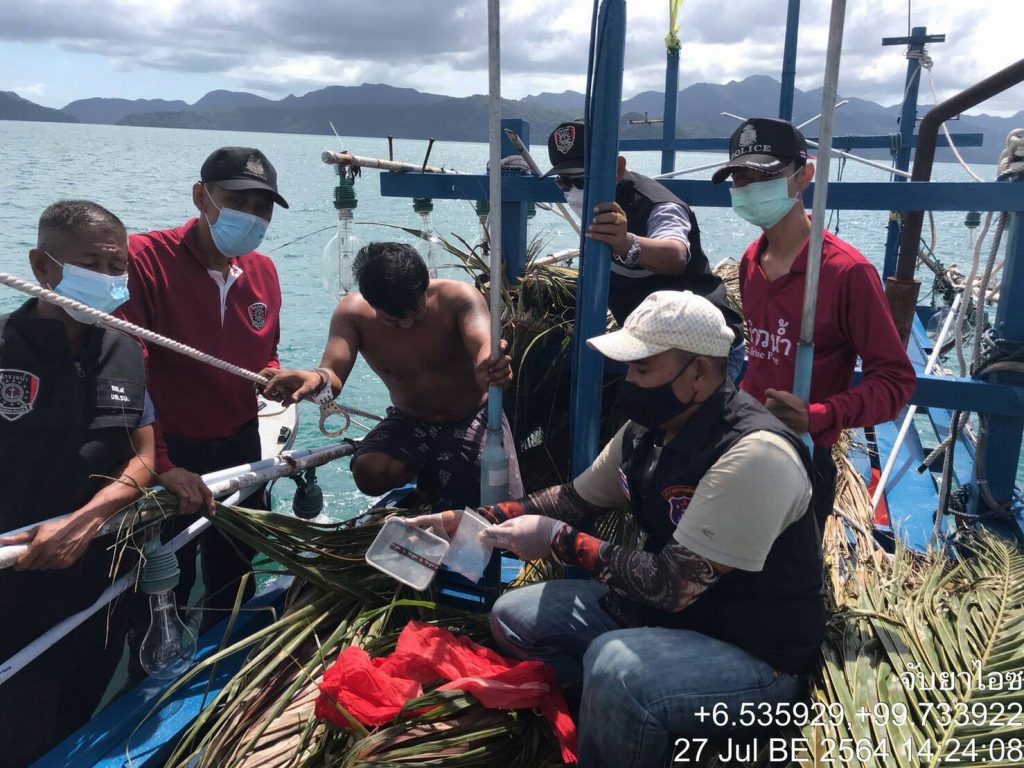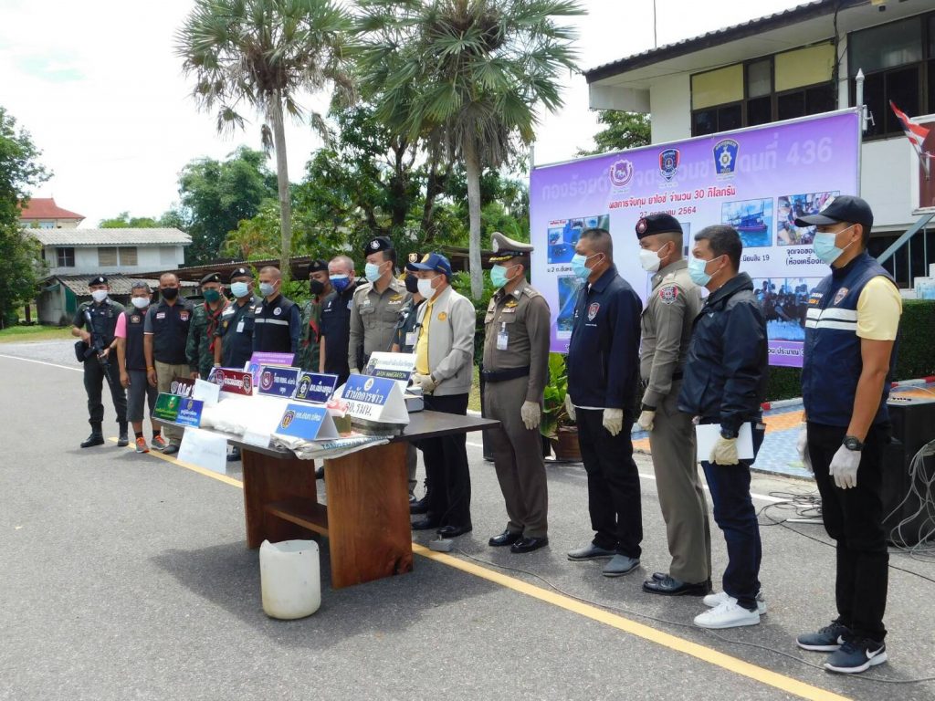 วันนี้28 ก.ค.2564 นายเอกรัฐ หลีเส็น ผู้ว่าราชการจังหวัดสตูล,พ.ต.อ.สมชาย ศรีศรยุทธ์ รอง ผบก.ตชด.ภาค 4,พ.ต.ท.ธีรศักดิ์ ศรีราชยา ผบ.ร้อย ตชด.436,ร.ต.อ.พรเทพ หมื่นแกล้ว รอง ผบ.ร้อย ตชด.436 สนธิกำลังกับตำรวจน้ำสตูล,ชุดสืบสวน สภ.เมืองสตูล,กอ.รมน.จังหวัดสตูล,ชุด ชปข.ร้อย ตชด.436 , ตร.น้ำ สตูล,ชุดสืบสวน สภ.เมืองสตูล,ตำรวจตม.สตูล เข้าจับกุมผู้กระทำความผิด พรบ. ยาเสพติดหลังจากได้รับแจ้งจากสายข่าวว่ามีชายอายุประมาณ 30ถึง35 ปี รูปร่างท้วมผิวดำแดงสูงประมาณ 160 -165 ซม. ซึ่ง ขับเรือปั่นไฟ ชื่อก.นิยมสิน 19 ซึ่งออกเรือหาปลาบริเวณร่องน้ำระหว่างเกาะตะรุเตากับเกาะราวี น่าจะมียาเสพติดยา(ไอซ์) ซุกซ่อนอยู่จึงขอให้เจ้าหน้าที่เข้าตรวจสอบโดยด่วนๆเจ้าหน้าที่ชุดจับกุมจึงได้รายงานให้ผู้บังคับบัญชาทราบและได้รับคำสั่งให้เดินทางเข้าตรวจสอบเรือดังกล่าวเจ้าหน้าที่ชุดจับกุมจึงได้ประสานกับหน่วยงานที่เกี่ยวข้องเพื่อประชุมวางแผนที่กองร้อยตชด 436 ในการเข้าทำการตรวจค้นจับกุมและได้ประสานกับตำรวจน้ำจังหวัดสตูลเพื่อขอสนับสนุนเรือตรวจการณ์ 521 ของทางตำรวจน้ำเพื่อเข้าทำการตรวจสอบในวันที่ 27 กรกฎาคม 2564 เจ้าหน้าที่ชุดจับกุมได้เจอเรือปั่นไฟชื่อก.นิยมสิน 19 ลอยลำอยู่บริเวณร่องน้ำเกาะแกวใหญ่หมู่ 2 ตำบลตันหยงโป อำเภอเมือง จังหวัดสตูลจึงได้นำเรือเข้าเทียบเพื่อขอทำการตรวจสอบพบชายวัยรุ่น 1 คนนั่งอยู่บริเวณท้ายเรือดังกล่าว ลักษณะตรงตามที่สายรับแจ้งไว้เมื่อชายดังกล่าวเห็นเจ้าหน้าที่ชุดจับกุมได้แสดงอาการมีพิรุธ ลุกลี้ลุกลนเจ้าหน้าที่ชุดจับกุมจึงได้แสดงตัวเป็นเจ้าหน้าที่ตำรวจต่อมาเจ้าหน้าที่ได้สอบถามชื่อของชายวัยรุ่นคนดังกล่าวทราบชื่อนายจเร หรือตี๋ แห่ชู อยู่บ้านเลขที่ 167 หมู่ 1 ตำบลเกตรี อำเภอเมือง จังหวัดสตูลเจ้าหน้าที่ชุดจับกุมจึงขอทำการตรวจค้นตัวและเรือผลการตรวจสอบพบกระสอบยาเสพติด(ยาไอซ์)จำนวน 3 กระสอบซุกซ่อนอยู่ในห้องเครื่องบริเวณหัวเรือปั่นไฟ ชื่อก.นิยมสิน 19 ทั้งหมดจำนวน 29 ก้อนและบรรจุอยู่ในถุงพลาสติกจำนวน 2 ถุงน้ำหนักรวมประมาณ 30 กิโลกรัมมูลค่ายาไอซ์ประมาณ 6,000,000 บาทตรวจพร้อมทั้งยึดเรือจำนวน 1 ลำ ราคาประมาณ 4,000,000 บาท ผู้ถูกจับกุมให้การรับสารภาพว่ายาดังกล่าวเป็นของตนจริงเมื่อวันที่ 11 มิถุนายน 2564 ผู้ถูกจับกุมได้ออกเรือปั่นไฟไปทางทิศใต้ของเกาะหลีเป๊ะเพื่อหาปลาและเมื่อวันที่ 21 มิถุนายน 2564 เวลาประมาณ 9.00 น ได้สังเกตเห็นกระสอบสีขาวจำนวน 5 กระสอบลอยตามกระแสน้ำจากนั้นและเรือไปเพื่อเก็บกระสอบดังกล่าวและได้เปิดดูภายในพบยาเสพติด(ยาไอซ์)ซุกซ่อนอยู่ภายในกระสอบจาก