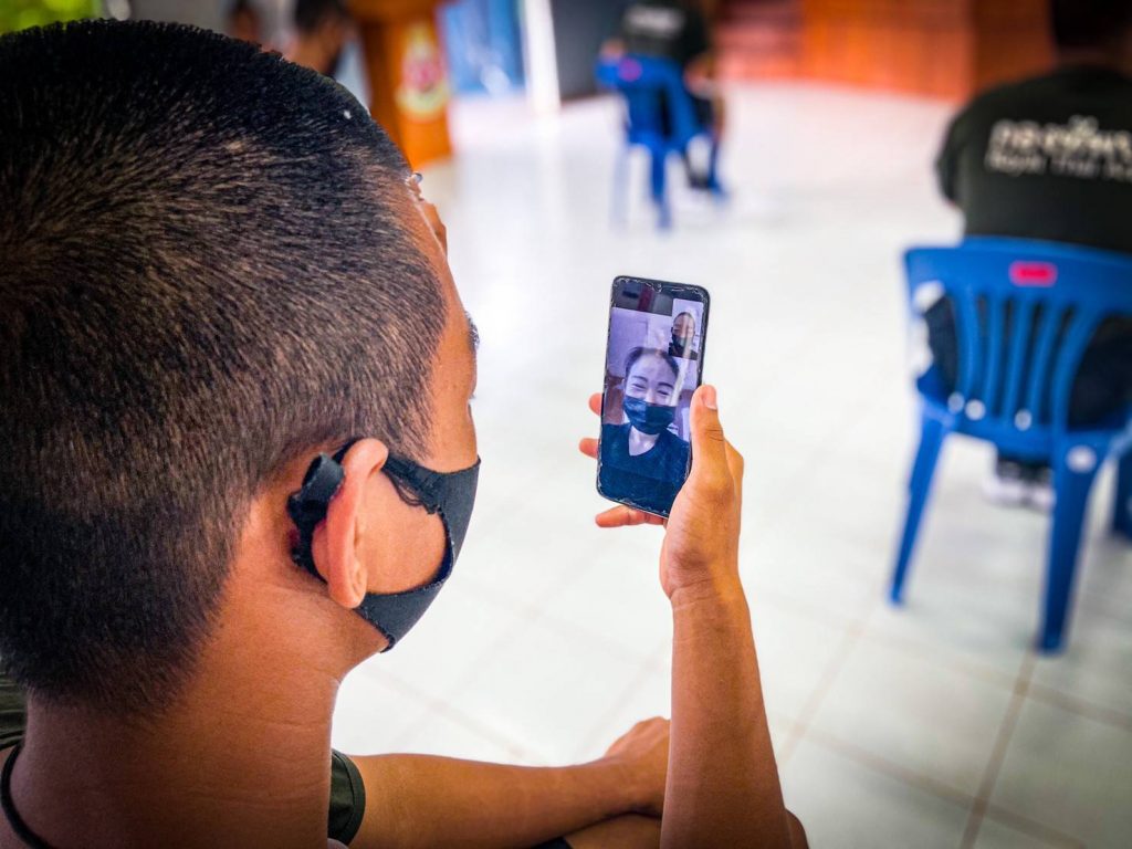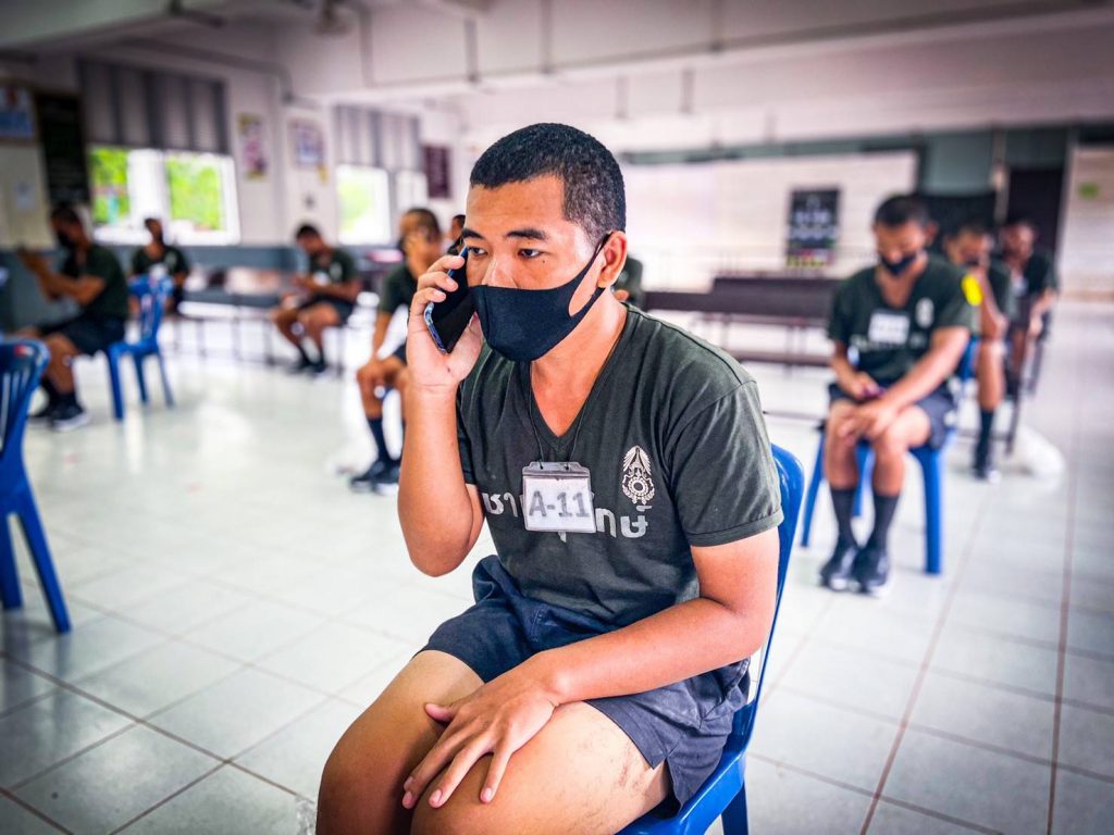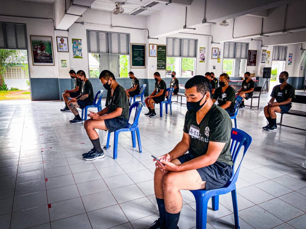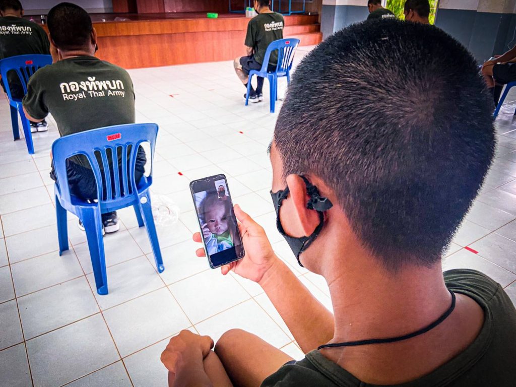 __ วันที่ 26 ก.ค.2564 ที่ค่ายพระยอดเมืองขวาง ตำบลกุรุคุ อำเภอเมือง จังหวัดนครพนม ผู้สื่อข่าวรายงานว่า พันโท ศรณณัฐ นวลมณี ผู้บังคับกองพันทหารราบที่ 3 กรมทหารราบที่ 3 (ผบ.ร.3 พัน.3) ใจดีให้น้องๆทหารกองประจำการผลัด 1/64 พบปะพูดคุยกับญาติๆในรูปแบบออนไลน์เพื่อคลายความคิดถึงบ้านสอดคล้องแนวทาง ศบค. สู่การเป็นหน่วยทหารปลอดโควิด ปรับรูปแบบการฝึกพร้อมดูแลความเป็นอยู่ของทหารใหม่อย่างใกล้ชิด โดยน้องๆทหารกองประจำการผลัด 1/64 ได้เข้าประจำการเมื่อต้นเดือน ก.ค. 64 ที่ผ่านมาได้ทำการกักตัวเป็นเวลา 14 วัน ซึ่งหลังจากนี้ไปตลอดทั้ง 6 สัปดาห์ หน่วยฝึกจะเริ่มดำเนินการฝึกควบคู่การดำเนินชีวิตวิถีใหม่ (New Normal) ภายใต้แนวทางการควบคุมโควิด-19 อย่างเคร่งครัด ด้วยมาตราการ Bubble and Seal โดยครูฝึกและทหารใหม่ ตลอดจนเจ้าหน้าที่เกี่ยวข้องทุกนายจะถูกจำกัดให้อยู่แต่ภายในหน่วยฝึกที่เป็นระบบปิด เพื่อให้เกิดความปลอดภัยและปลอดเชื้อภายในหน่วยทหารอย่างสูงสุดในส่วนของการฝึกจะทำการแยกฝึกเป็นกลุ่มย่อยในที่ร่มที่มีอากาศถ่ายเทสะดวก โดยจะฝึกจากขั้นพื้นฐานในเรื่องระเบียบวินัย แบบธรรมเนียมทหาร การฝึกบุคคลท่ามือเปล่า การฝึกทางยุทธวิธี หน้าที่พลเมือง การบรรเทาสาธารณภัย และการปฐมพยาบาลเบื้องต้น พร้อมสร้างการรับรู้เกี่ยวกับโควิด-19 ควบคู่กับการออกกำลังพัฒนาสมรรถภาพร่างกายให้แข็งแรงสมบูรณ์เพื่อให้มีความพร้อมในการปฏิบัติภารกิจ