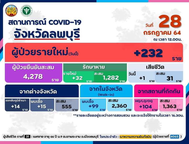 วันนี้ได้รับข่าวร้ายใจสลายน้ำตาร้องหน้าอีกครั้ง ในสถานการณ์ covid 19 ในจังหวัดลพบุรี ทำให้เกิดวิกฤตหนักขึ้นมาอีกครั้ง วันนี้มีผู้เสียชีวิต1 ราย ทำให้ตัวเลขผู้เสียชีวิตพุ่งถึง 31 ราย แตะเพดานตัวเลขผู้ป่วยสะสมถึง 4,278 ราย