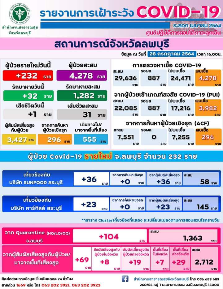 วันนี้ได้รับข่าวร้ายใจสลาย น้ำตาจะไหลอีกครั้ง ในสถานการณ์ covid 19 ในจังหวัดลพบุรี ทำให้เกิดวิกฤตหนักขึ้นมาอีกครั้ง วันนี้มีผู้เสียชีวิต1ราย ผู้เสียชีวิตรายที่ 31 เพศชายอายุ 66 ปี หมู่ที่ 9 พื้นที่ตำบลเขาพระงาม อำเภอเมือง จังหวัดลพบุรี (ผู้ป่วยรายที่ 4065) ทำให้จังหวัดลพบุรีเกิดวิกฤตหนักมาทันที ประชาชนชาวลพบุรีเรียกร้องการฉีดวัคซีน ให้กับประชาชนทั่วไป ตอนนี้ไร้วี่แววจากเจ้าหน้าที่ติดต่อกลับ ทำให้รอความตายใกล้มาถึงตัวแล้ว