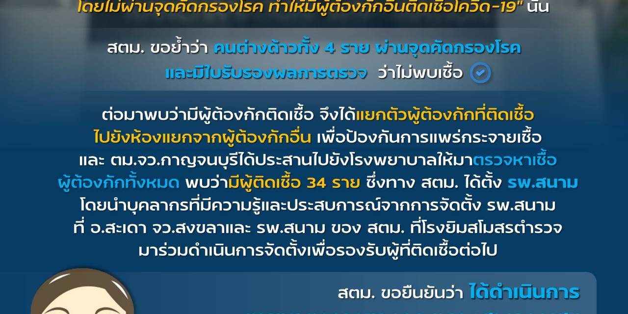 ตามที่ปรากฏข่าวตามสื่อออนไลน์ กรณี ตม.จ.กาญจนบุรี รับ 4 ต่างด้าว โดยไม่ผ่านจุดคัดกรองโรค ทำให้มีผู้ต้องกักอื่นติดเชื้อโควิด-19 นั้น