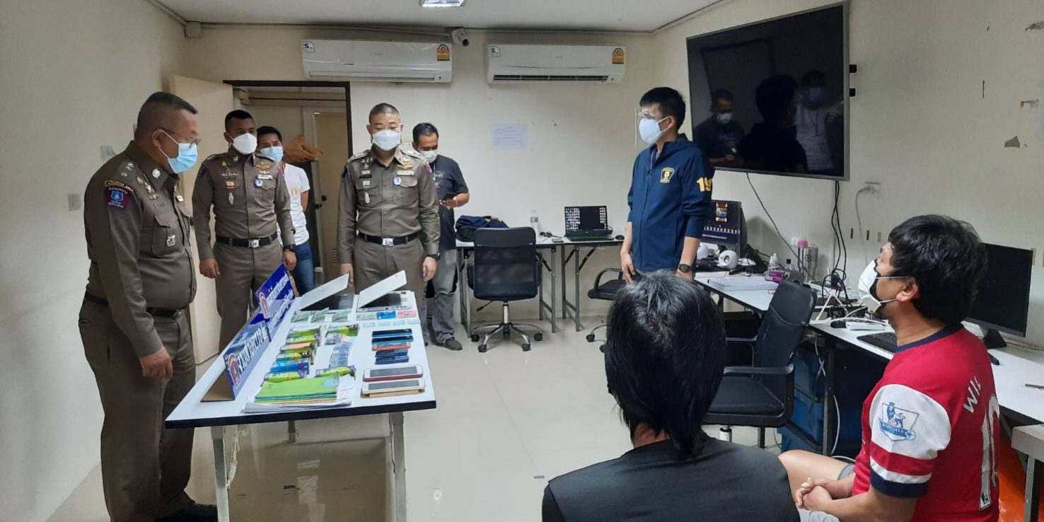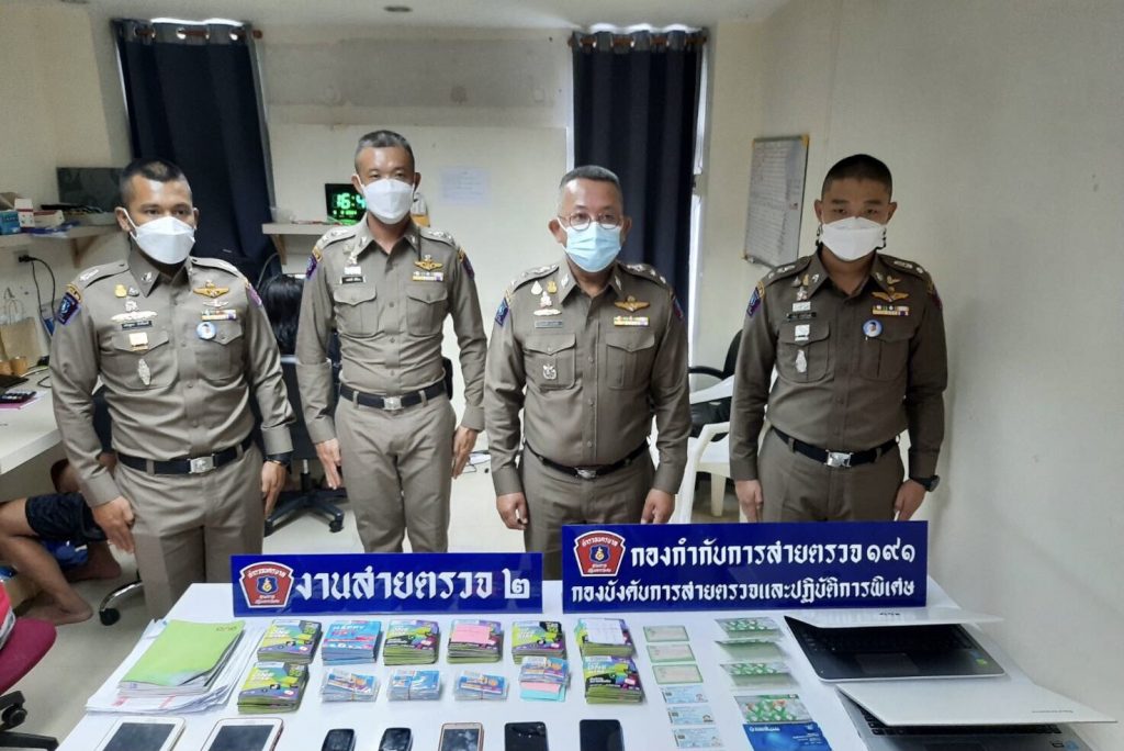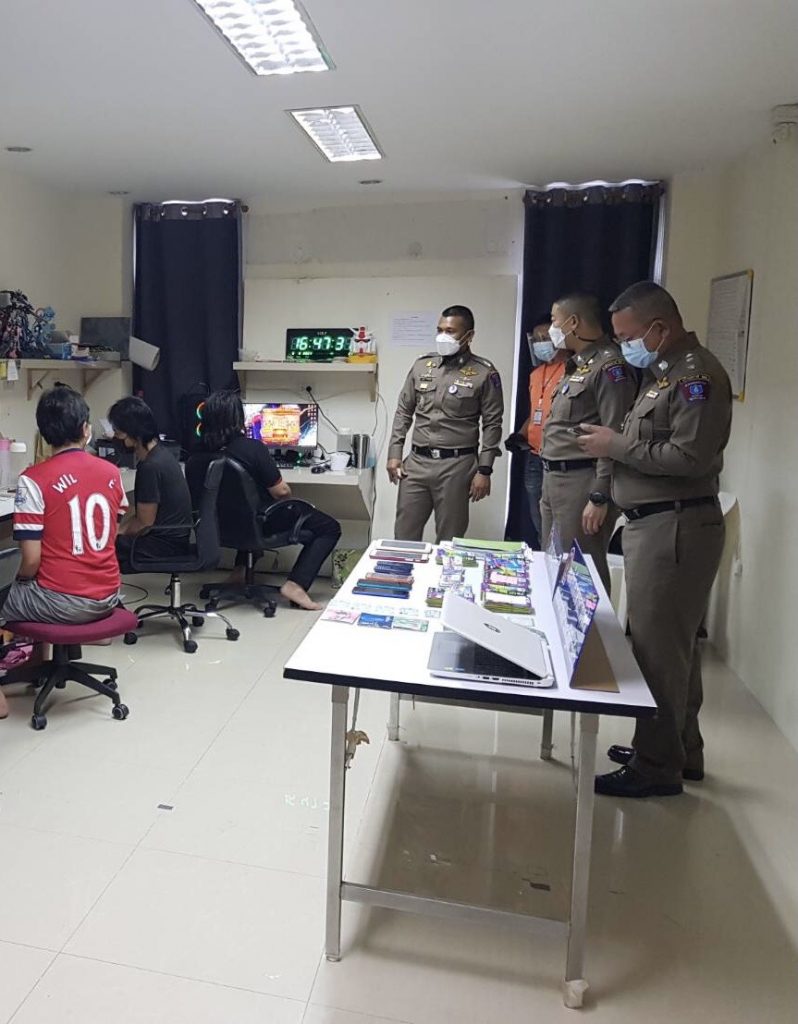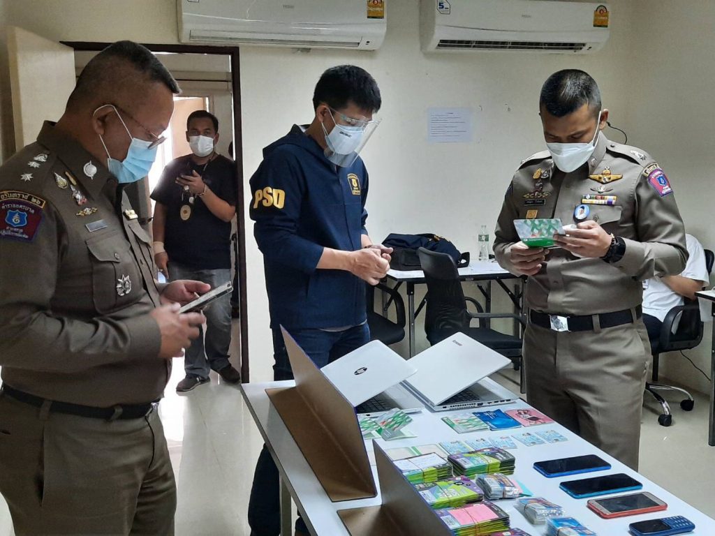 พร้อมด้วยของกลาง ชุดคอมพิวเตอร์ (พร้อมอุปกรณ์ คีย์บอร์ด,เม้าส์,จอคอมพิวเตอร์) จำนวน 2 ชุด,คอมพิวเตอร์โน๊ตบุ๊ค จำนวน 2 เครื่อง,โทรศัพท์มือถือ จำนวน 5 เครื่อง,แท๊ปเล็ต จำนวน 2 เครื่อง,ซิมการ์ด รวม 240 ซิม,สมุดบัญชีธนาคาร จำนวน 3 เล่ม,บัตรกดเงินสด จำนวน 3 ใบ และตัวปล่อยสัญญาณอินเตอร์เน็ต จำนวน 1 เครื่อง