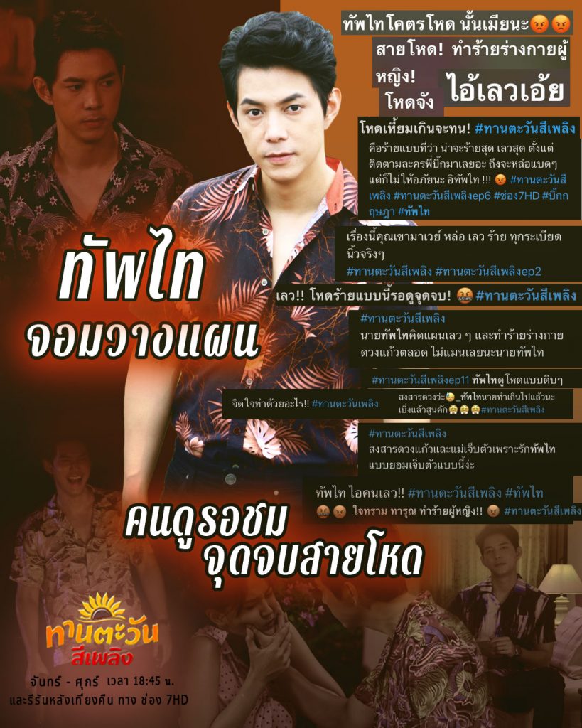 นอกจากนี้ยังมีกระแสของ 2 ตัวละครที่ถูกกล่าวขวัญในโลกโซเชียลมากที่สุด “ทัพไท” ที่รับบทโดย บิ๊ก กฤษฎา ดาวร้ายหน้าหล่อ แต่โหดสุดๆ ส่วนนักแสดงสาว อิงฟ้า เกตุคำ ผู้รับบท “ดวงแก้ว” หญิงสาวที่ถูกกระทำย่ำยี ทั้งโดนตบ ทั้งโดนซ้อม แถมยังถูกด่าในโลกโซเชียลแบบกระหน่ำซัมเมอร์เซล จนติดแฮชแท็กว่า “เจ็บแล้วไม่จำ”