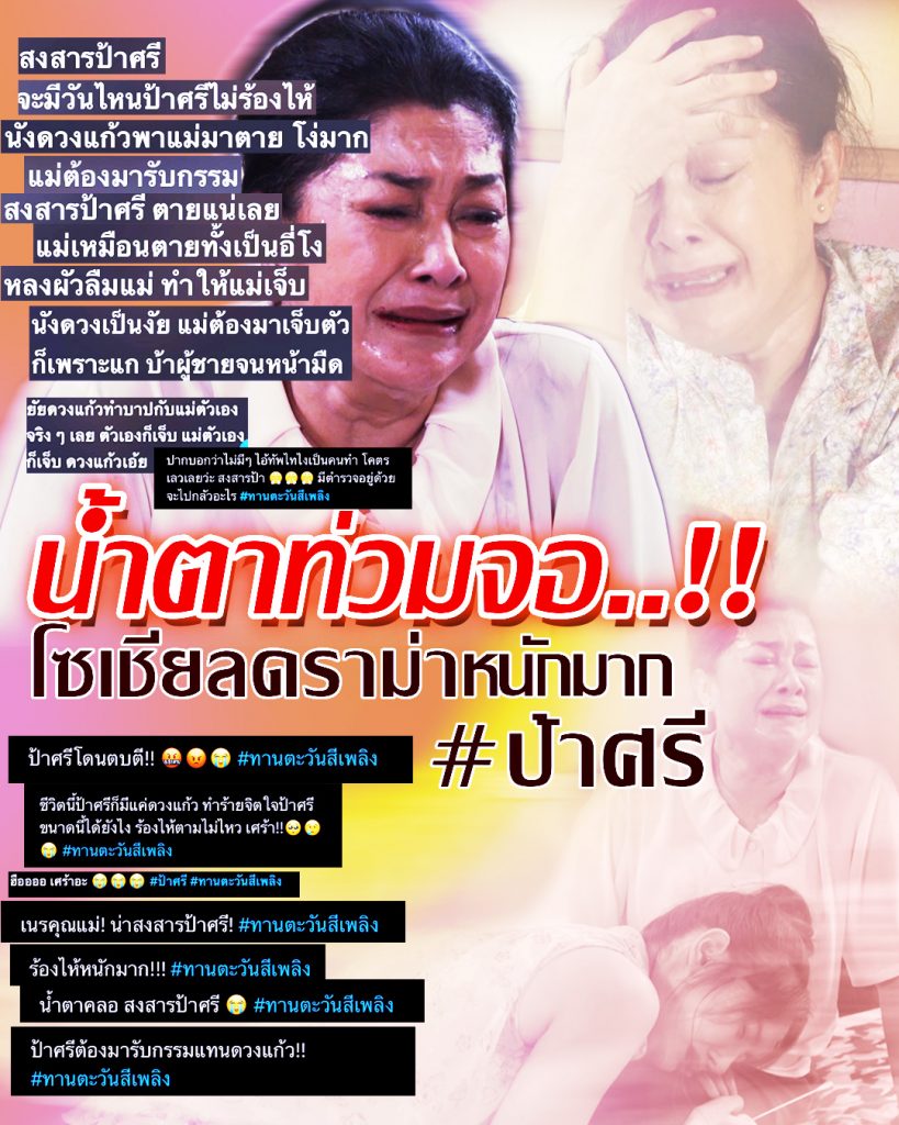 ส่วนตัวละครที่มาแรงแซงทางโค้งไม่แพ้กันอย่าง “ป้าศรี” ที่รับบทโดย ปนัดดา โกมารทัต ฉากเด็ดเมื่อค่ำคืนที่ผ่านมา (พฤหัสบดีที่ 5 สิงหาคม) ก็ทำเอาคนดูถึงกับน้ำตาซึมไปกับฉากร้องไห้ คร่ำครวญ ถึงการกระทำของ ดวงแก้ว ที่เชื่อว่าใครที่ได้ดูฉากนี้คงต้องน้ำตารื้นไปตามๆ กัน ส่วนกระแสในโซเชียลไม่ต้องพูดถึง กระหน่ำคอมเม้นท์แบบทั่วถึง ประหนึ่ง “น้ำตาท่วมจอ”