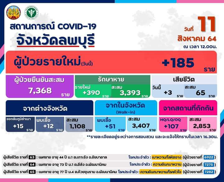 รายงานสถานการณ์โควิด-19 จังหวัดลพบุรี วันพุธที่ 11 สิงหาคม 2564 ณ เวลา 12.00 น.