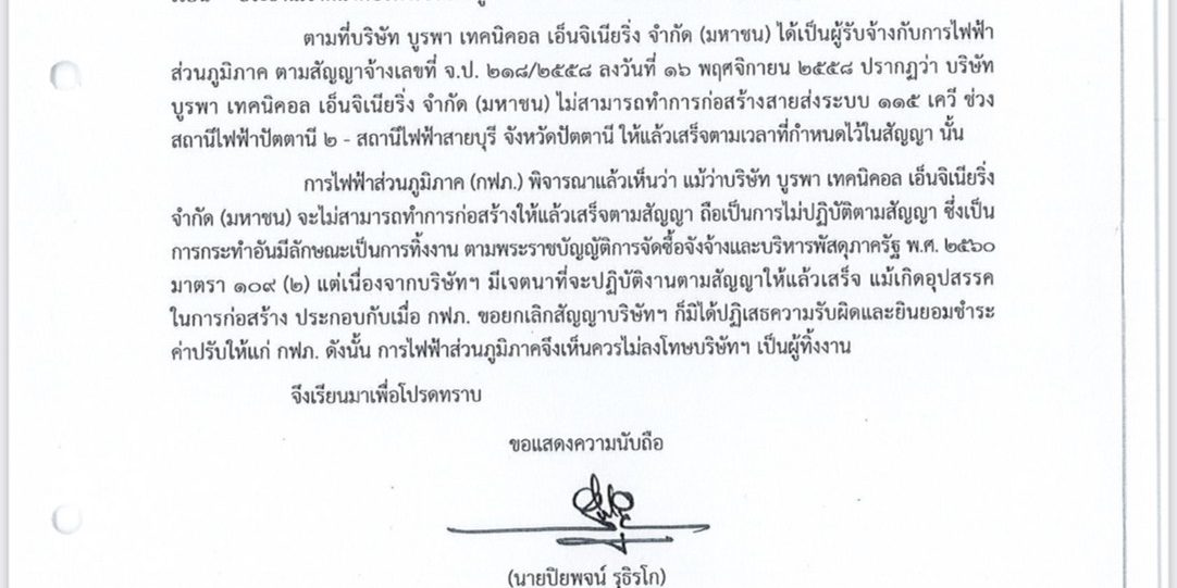 บมจ.บูรพาฯ ร่อนหนังสือแจง หลัง กฟภ.กลับลำแจ้ง ปลัดกระทรวงการคลังให้บริษัทฯ เป็นผู้ทิ้งงานระบบไฟฟ้าปัตตานี ยืนยันกรณีดังกล่าวแสดงเหตุผลและเสียค่าปรับกระบวนการจบสิ้นแล้วได้รับการยกเว้นไม่ต้องถูกลงโทษ ตั้งข้อสงสัยเหตุใดจึงมาเป็นข่าวช่วงที่บริษัทฯ ประกวดสัญญาหลายโครงการ