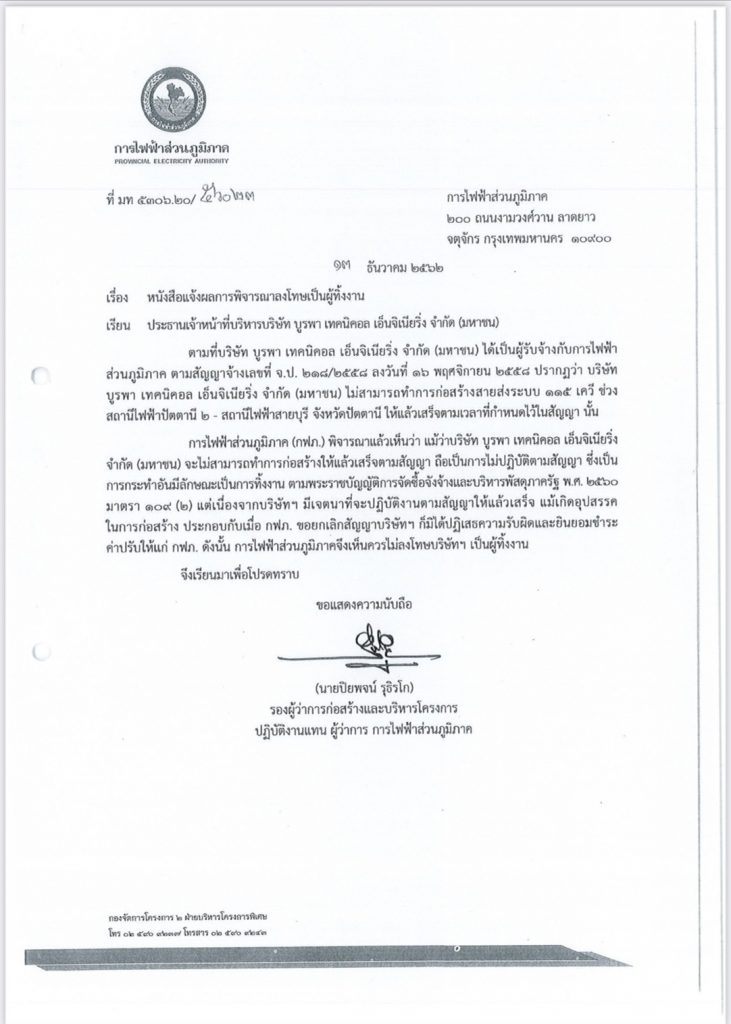 จากกรณีดังกล่าวส่งผลให้ผู้ถือหุ้นและผู้มีส่วนเกี่ยวข้องสอบถามข้อมูลมาที่บริษัทฯ เป็นจำนวนมาก บริษัทฯ จึงขอชี้แจงว่า บริษัทฯ ได้รับจ้างกับการไฟฟ้าฯในโครงการนี้ ต่อมาเมื่อถูกบอกเลิกสัญญาจ้าง บริษัทฯ ถูกเรียกชี้แจงซึ่งบริษัทฯ ได้ชี้แจงแสดงเหตุผลครบถ้วน และบริษัทฯ ได้จ่ายค่าปรับและค่าเสียหายไปร่วม 26 ล้านบาทให้การไฟฟ้าฯแล้ว ภายหลังการพิจารณาเสร็จสิ้น การไฟฟ้าฯได้แจ้ง หนังสือ ที่ มท.5306.20/56023 ลงวันที่ 13 ธันวาคม 2562 เรื่องหนังสือแจ้งผลการพิจารณาลงโทษเป็นผู้ทิ้งงาน ให้บริษัทฯ ทราบว่าบริษัทฯ ได้รับยกเว้นไม่ต้องถูกลงโทษเป็นผู้ทิ้งงาน เพราะบริษัทฯ ไม่ได้จงใจที่ จะทำงานให้เกิดความเสียหายแก่การไฟฟ้าฯ กระบวนการพิจารณาลงโทษให้เป็นผู้ทิ้งงานของโครงการนี้ จึงต้องปิดกระบวนการลงโดยสมบูรณ์ตามกฎหมายและระเบียบที่เกี่ยวข้องทุกประการ