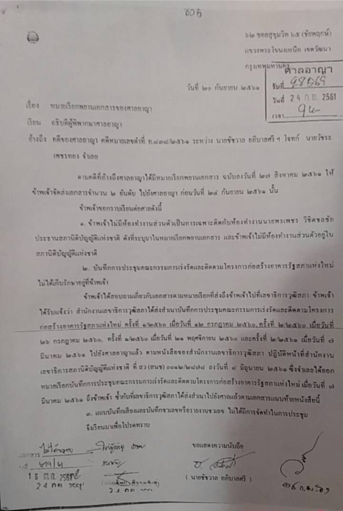 ต่อมานายวัชระ ได้ฟ้องนายชัชวาลย์ ในความผิดตามประมวลกฎหมายอาญา ม. 137 ,157 จงใจแจ้งความเท็จว่าไม่มีการจดบันทึกการประชุมของคณะกรรมการเร่งรัดและติดตามโครงการก่อสร้างอาคารรัฐสภาแห่งใหม่ เพื่อจะได้ไม่ต้องส่งแถบเสียง ชวเลข หรือรายงานการประชุมดังกล่าวต่อศาล ตามที่โจทก์ร้องขอเพื่อให้เป็นหลักฐานในการต่อสู้คดีดังกล่าว ซึ่งในการแจ้งข้อความเท็จนี้เป็นการปฏิบัติหรือละเว้นหน้าที่โดยมิชอบ เพื่อให้เกิดความเสียหายแก่โจทก์ ผู้อื่นหรือประชาชน หรือปฏิบัติหรือละเว้นการปฏิบัติหน้าที่โดยทุจริต ซึ่งหากศาลพิพากษาว่าจำเลยมีความผิดตามม.137 ผู้ใดแจ้งข้อความอันเป็นเท็จแก่เจ้าพนักงานซึ่งอาจทำให้ผู้อื่นหรือประชาชนเสียหาย ต้องระวางโทษจำคุกไม่เกินหกเดือน หรือปรับไม่เกินหนึ่งพันบาท หรือทั้งจำทั้งปรับ ส่วนม. 157 บัญญัติว่า “ผู้ใดเป็นเจ้าพนักงาน ปฏิบัติหรือละเว้นการปฏิบัติหน้าที่โดยมิชอบเพื่อให้เกิดความเสียหายแก่ผู้หนึ่งผู้ใด หรือปฏิบัติหรือละเว้นการปฏิบัติหน้าที่โดยทุจริต ต้องระวางโทษจำคุกตั้งแต่1-10 ปีหรือปรับตั้งแต่ 2,000 -20,000 บาท หรือทั้งจำทั้งปรับ