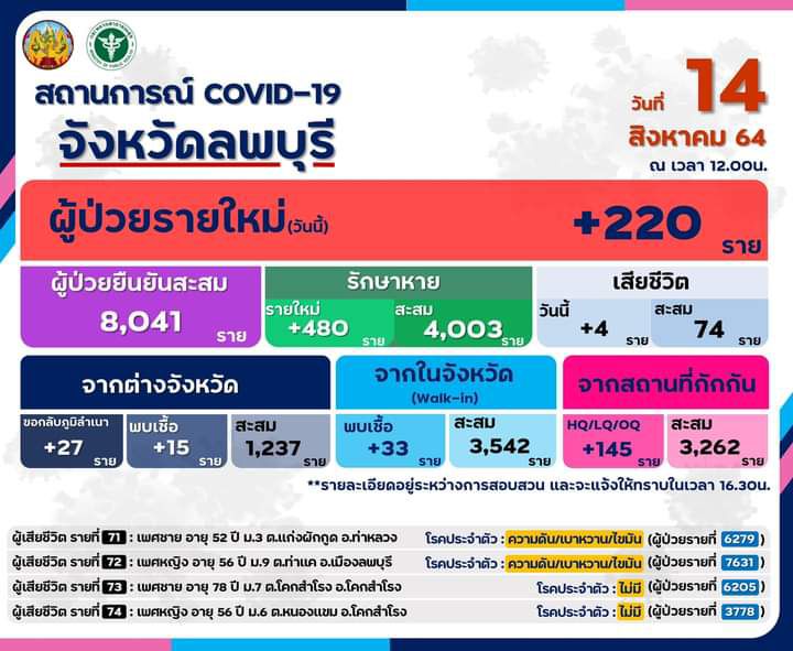 รายงานสถานการณ์โควิด-19 จังหวัดลพบุรี วันเสาร์ที่ 14 สิงหาคม 2564 ณ เวลา 12.00 น.
