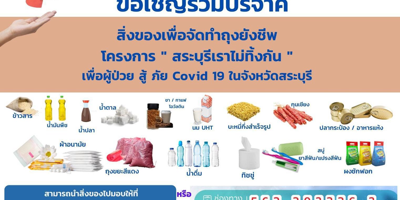 วันที่16สิงหาคม 2564 จิตอาสาฯ ร่วมแพคถุงยังชีพ และมอบถุงยังชีพให้กับ 4 อำเภอแรก โดย นางวรรณภา ชินชูศักดิ์ ประธานหอการค้าจังหวัดสระบุรี ร่วมสนับสนุนและร่วมแพ็คถุงยังชีพในโครงการ “สระบุรีเราไม่ทิ้งกัน” เพื่อมอบให้ประชาชนผู้กักตัว Home isolation/ผู้ประสบภัย Covid 19 เพื่อมอบให้อำเภอทั้ง13 อำเภอ โดยมีเป้าหมายที่ 5,000 ถุง เราจะรวบรวมสิ่งของในวันราชการและช่วยกันแพคในวันอาทิตย์จึงขอเชิญชวนมาเป็นจิตอาสาฯช่วยกันแพ็คและบริจาคสิ่งของได้ที่หอประชุมพุทธสมาคมสว่างรัตนตรัยธรรมสถาน (โรงเจ) จังหวัดสระบุรี หรือสมทบทุนเพื่อจัดซื้อสิ่งของบริจาคกับทางหอการค้าจังหวัดสระบุรีได้ตลอดเวลา