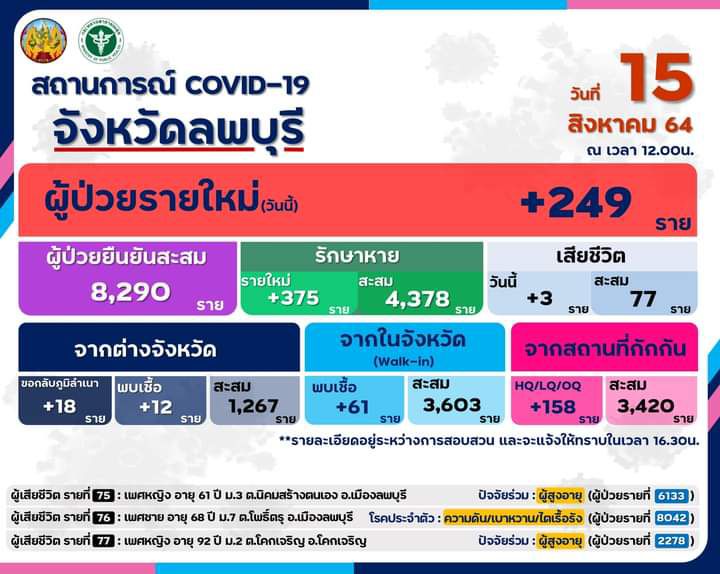 รายงานสถานการณ์โควิด-19 จังหวัดลพบุรี วันอาทิตย์ที่ 15 สิงหาคม 2564 ณ เวลา 12.00 น.