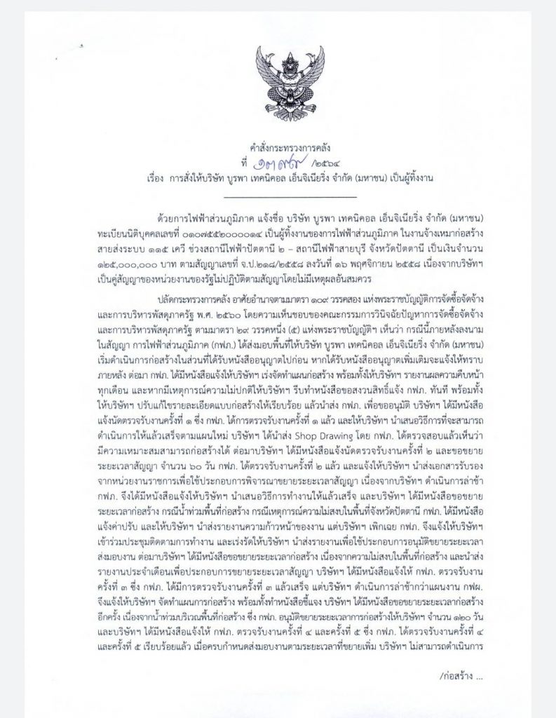 ด้วยการไฟฟ้าส่วนภูมิภาค แจ้งชื่อ บริษัท บูรพา เทคนิคอล เอ็นจิเนียวิ่ง จำกัด (มหาชน) เป็นผู้ทิ้งงานของการไฟฟ้าส่วนภูมิภาค ในงานจ้างเหมาก่อสร้าง สายส่งระบบ 115 เควี ช่วงสถานีไฟฟ้าปัตตานี 2- สถานีไฟฟ้าสายบุรี จังหวัดปัตตานี เป็นเงินจำนวน 125 ล้านบาท ตามสัญญาเลขที่ จ.ป.218/2558 ลงวันที่ 16 พฤศจิกายน 2558 เนื่องจากบริษัทฯ เป็นคู่สัญญาของหน่วยงานของรัฐไม่ปฏิบัติตามสัญญาโดยไม่มีเหตุผลอันสมควร ปลัดกระทรวงการคลัง อาศัยอำนาจตามมาตรา 109 วรรคสอง แห่งพระราชบัญญัติการจัดซื้อจัดจ้างและการบริหารพัสดุภาครัฐ พ.ศ.2560 โดยความเห็นชอบของคณะกรรมการวินิจฉัยปัญหาการจัดซื้อจัดจ้างและการบริหารพัสดุภาครัฐ ตามมาตรา 29 วรรคหนึ่ง (5) แห่งพระราชบัญญัติฯ เห็นว่า กรณีนี้ภายหลังลงนามในสัญญา การไฟฟ้าส่วนภูมิภาค (กฟภ.) ได้ส่งมอบพื้นที่ให้บริษัท บูรพา เทคนิคอล เอ็นจิเนียริ่ง จำกัด (มหาชน) เริ่มดำเนินการก่อสร้างในส่วนที่ได้รับหนังสืออนุญาตไปก่อน หากได้รับหนังสืออนุญาตเพิ่มเติมจะแจ้งให้ทราบภายหลัง