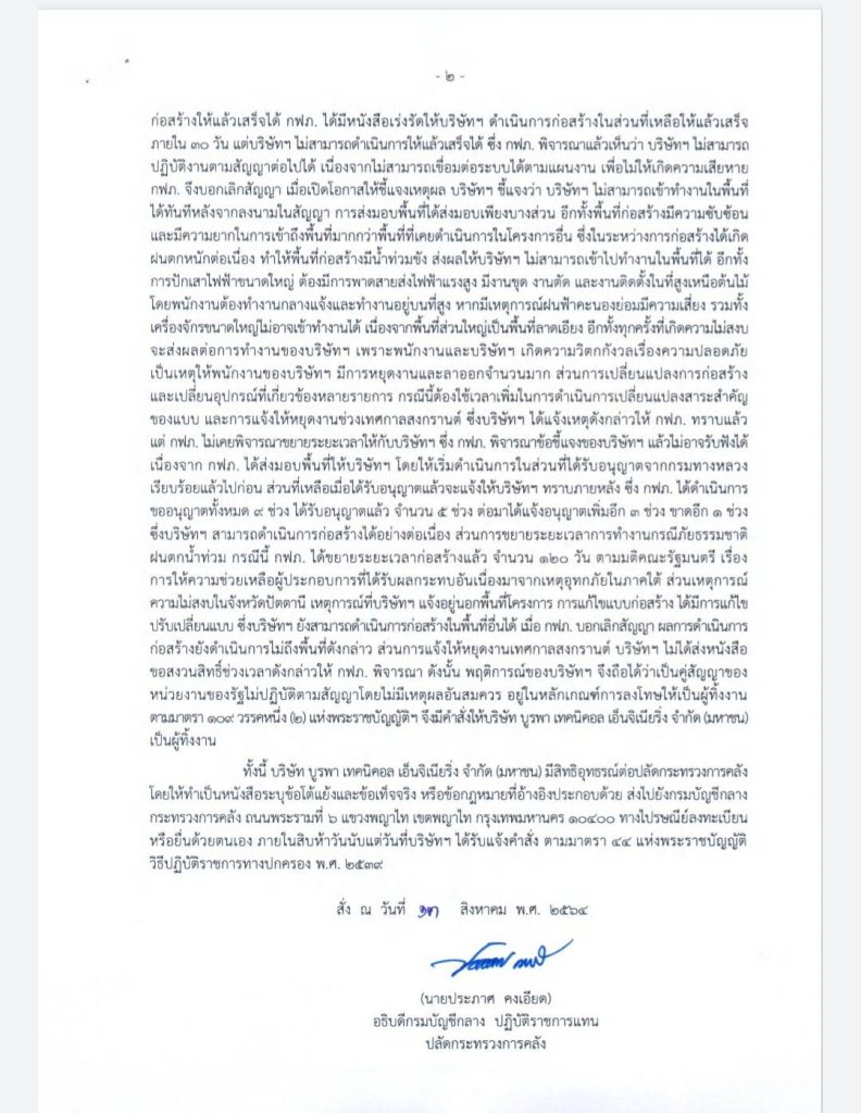 ต่อมาบริษัทฯ ได้มีหนังสือแจ้งนัดตรวจรับงานครั้งที่ 2 และขอขยายระยะเวลาสัญญา จำนวน 60 วัน (กฟภ.) ได้ตรวจรับงานครั้งที่ 2 แล้ว และแจ้งให้บริษัทฯ นำส่งเอกสารรับรองจากหน่วยงานราชการเพื่อใช้ประกอบการพิจารณาขยายระยะเวลาสัญญา เนื่องจากบริษัทฯ ดำเนินการล่าช้า (กฟภ.) จึงได้มีหนังสือแจ้งให้บริษัทฯ นำเสนอวิธีการทำงานให้แล้วเสร็จ และบริษัทฯ ได้มีหนังสือขอขยายระยะเวลาก่อสร้าง กรณีน้ำท่วมพื้นที่ก่อสร้าง กรณีเหตุการณ์ความไม่สงบในพื้นที่จังหวัดปัตตานี (กฟภ.) ได้มีหนังสือแจ้งค่าปรับ และให้บริษัทฯ นำส่งรายงานความก้าวหน้าของงาน แต่บริษัทฯ เพิกเฉย (กฟภ.) จึงแจ้งให้บริษัทฯ เข้าร่วมประชุมติดตามการทำงาน และเร่งรัดให้บริษัทฯ นำส่งรายงานเพื่อใช้ประกอบการอนุมัติขยายระยะเวลาส่งมอบงาน