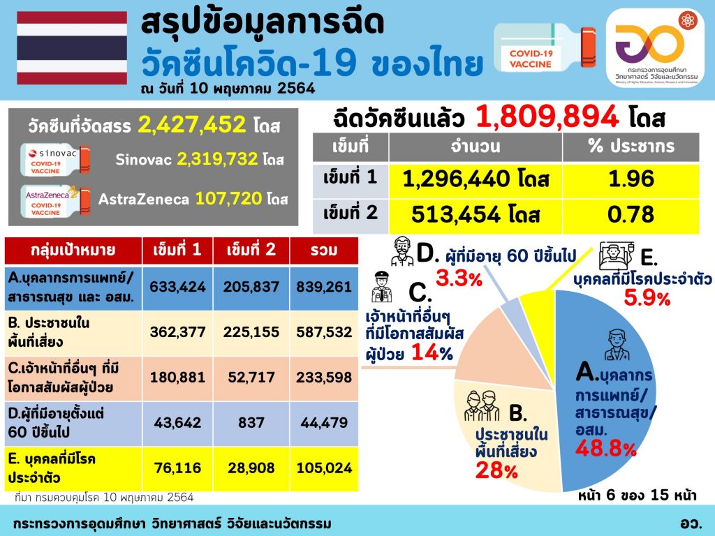 วันที่ 10 พฤษภาคม 2564 : ศาสตราจารย์ ดร.นายแพทย์สิริฤกษ์ ทรงศิวิไล ปลัดกระทรวงการอุดมศึกษา วิทยาศาสตร์ วิจัยและนวัตกรรม (อว.) รายงานว่า กระทรวง (อว.) ได้ติดตามและประมวลผลการฉีดวัคซีนโควิด-19 ทั่วโลกและในประเทศไทย โดยสรุปว่า “ขณะนี้ประเทศไทยได้ฉีดวัคซีนโควิด-19 แล้ว จำนวน 1,809,894 โดส โดยมีผู้ที่ได้รับวัคซีนแล้วอย่างน้อยหนึ่งเข็ม 1,296,440 คน หรือเท่ากับ 1.96% ของประชากร และฉีดครบสองเข็มแล้ว 513,454 คน (0.78% ของประชากร) ผู้ได้รับวัคซีนส่วนใหญ่ 48.8% เป็นบุคลากรการแพทย์/สาธารณสุข/อสม.,14.0% เป็นเจ้าหน้าที่อื่นๆที่มีโอกาสสัมผัสผู้ป่วย และ 28.0% เป็นประชาชนในพื้นที่เสี่ยง”