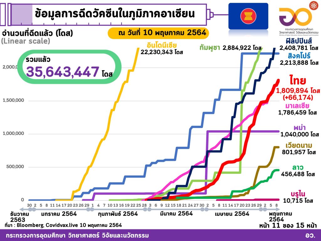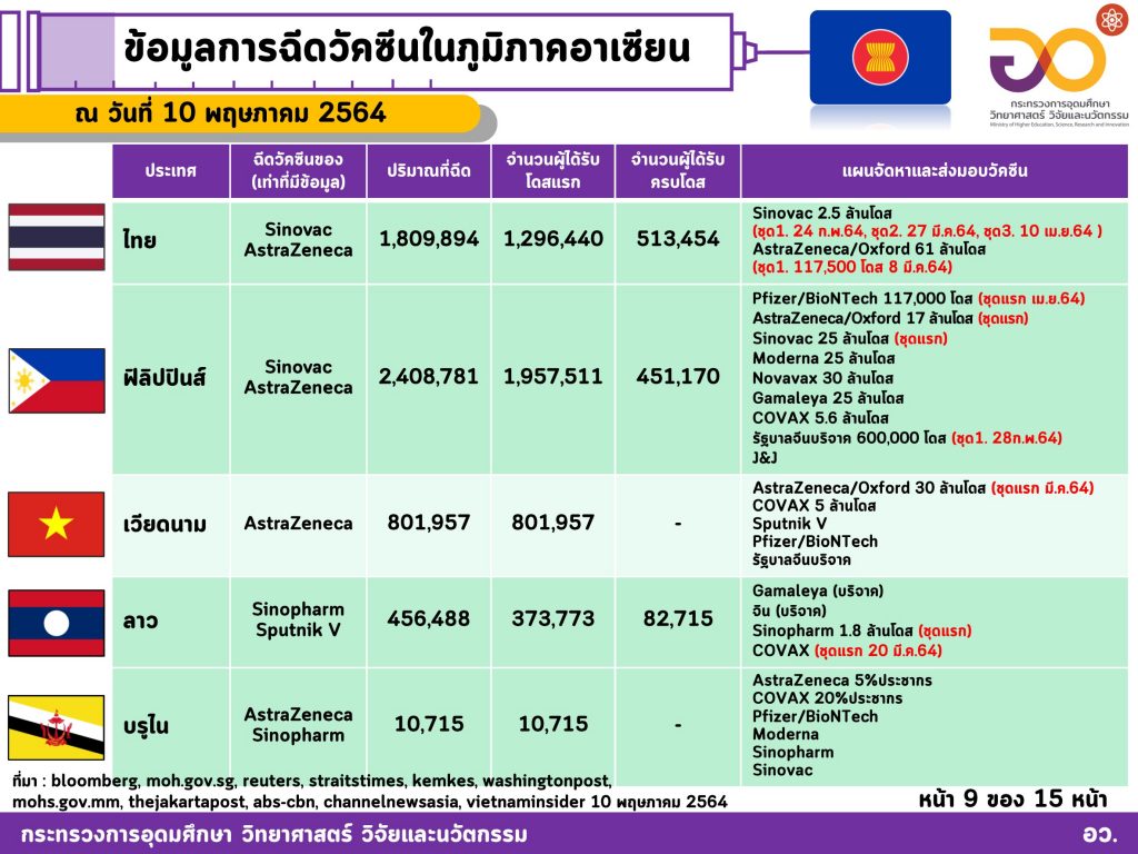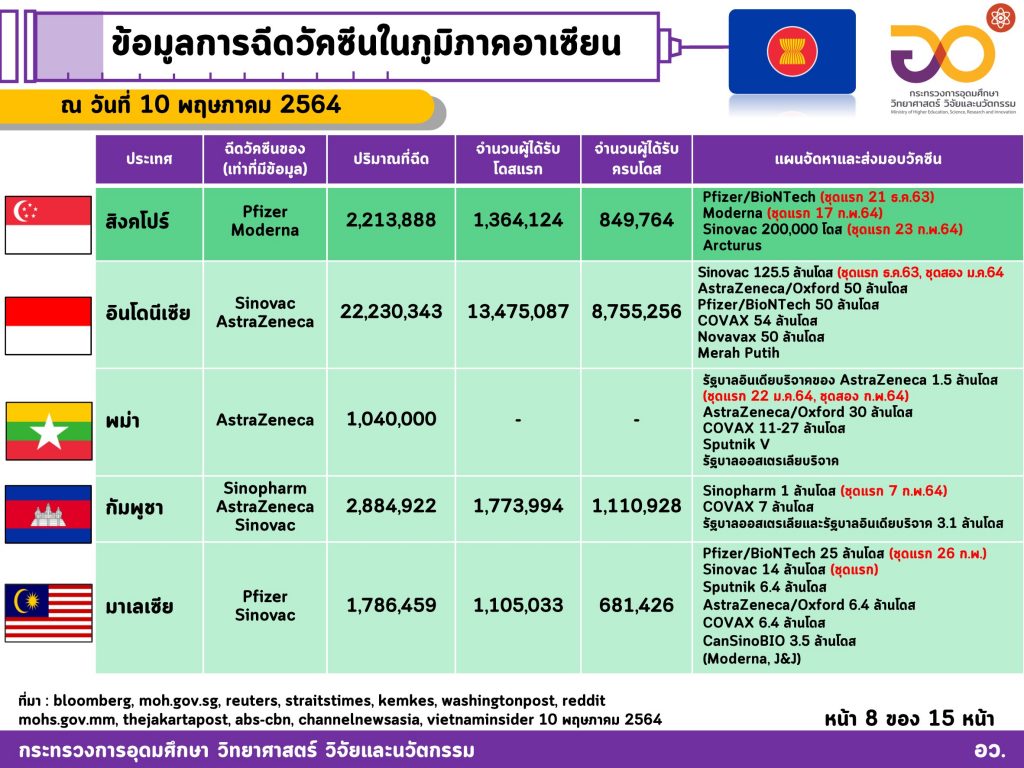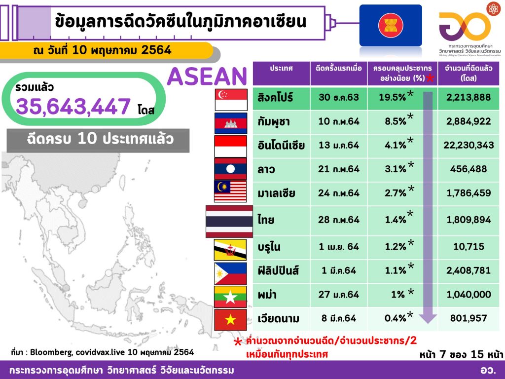 3.ในภูมิภาคอาเซียน ได้ฉีดวัคซีนแล้วครบ 10 ประเทศ รวมจำนวน 35,643,447 โดส ได้แก่ สิงคโปร์ จำนวน 2,213,888 โดส (ครอบคลุมอย่างน้อย 19.5%×ของประชากร),กัมพูชา จำนวน 2,884,922 โดส (8.5%×ของประชากร),อินโดนีเซีย จำนวน 22,230,343 โดส (4.1%×ของประชากร),ลาว จำนวน 456,488 โดส (3.1%×ของประชากร),มาเลเซีย จำนวน 1,786,459 โดส (2.7%× ของประชากร),ไทย จำนวน 1,809,894โดส (1.4%×ของประชากร),บรูไน จำนวน 10,715 โดส (1.2%×ของประชากร),ฟิลิปปินส์ จำนวน 2,408,781 โดส (1.1%×ของประชากร),พม่า จำนวน 1,040,000 โดส (1%×ของประชากร) และ เวียดนาม จำนวน 801,957 โดส (0.4%×ของประชากร)