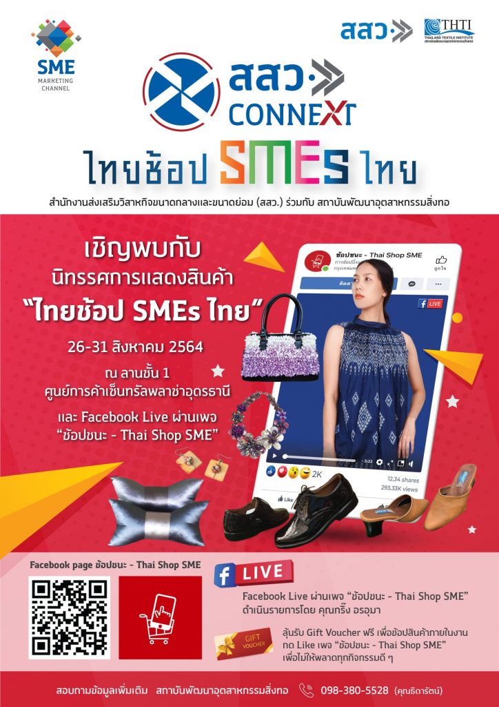สำนักงานส่งเสริมวิสาหกิจขนาดกลางและขนาดย่อม (สสว.) ร่วมกับ สถาบันพัฒนาอุตสาหกรรมสิ่งทอ ภายใต้โครงการพัฒนาศักยภาพและช่องทางการตลาดเชิงลึกสําหรับผู้ประกอบการ SME ปี 2564 จัดกิจกรรมขยายช่องทางการตลาดซึ่งเป็นการสร้างโอกาสในการจําหน่ายสินค้าให้ผู้ประกอบการ ฝ่าวิกฤติการระบาดไวรัสโควิด-19 สนับสนุนและส่งเสริมสินค้าผู้ประกอบการทั่วประเทศให้เป็นที่รู้จักอย่างแพร่หลาย และเพิ่มโอกาสในการจัดจำหน่ายให้แก่ผู้ประกอบการที่ร่วมโครงการทั่วประเทศกว่า 105 ร้านค้า อาทิ เสื้อผ้าแฟชั่น กระเป๋า รองเท้า หน้ากากผ้า และกลุ่มผลิตภัณฑ์สิ่งทอตกแต่งบ้าน ที่มีนวัตกรรม และมีคุณภาพ จากผู้ประกอบการ SMEs กลุ่มสิ่งทอ แฟชั่นและไลฟ์สไตล์