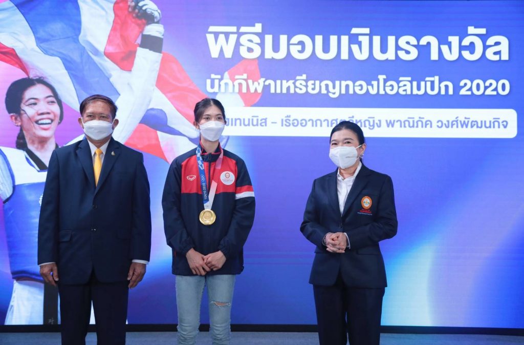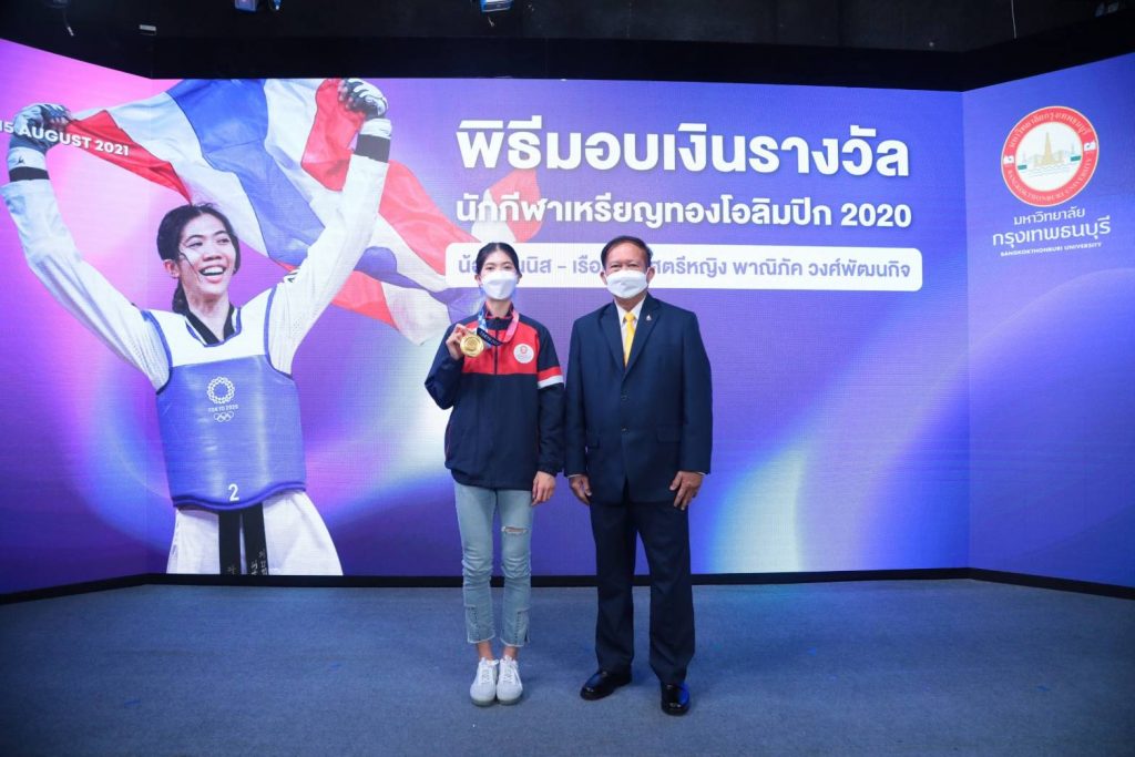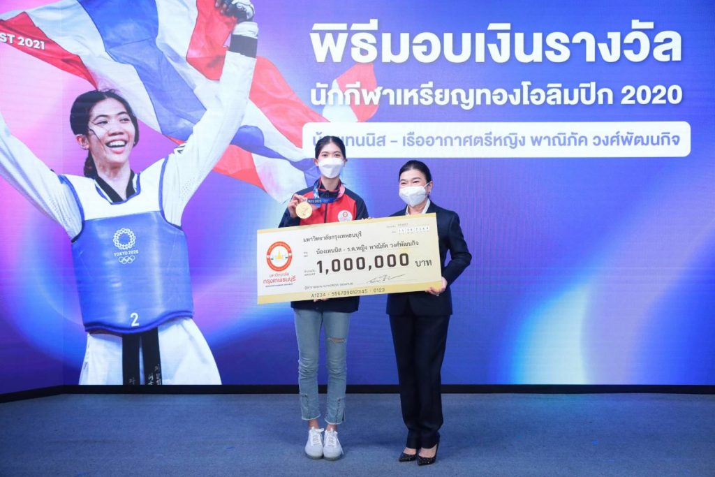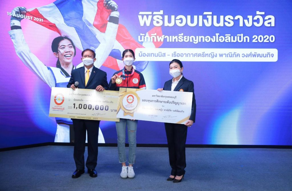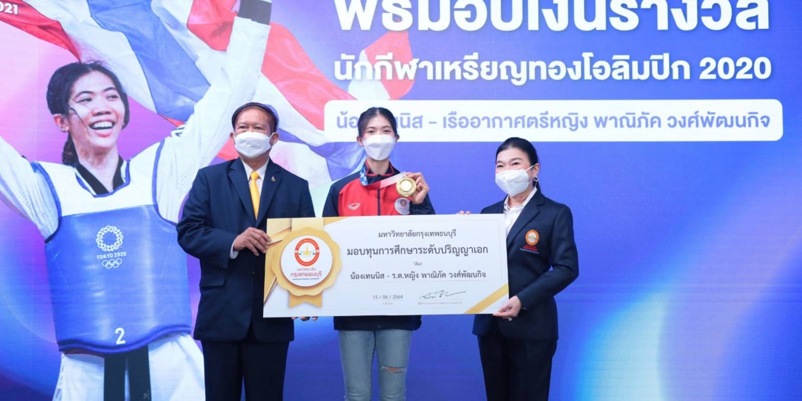 รศ.ดร.บังอร เบ็ญจาธิกุล อธิการบดีมหาวิทยาลัยกรุงเทพธนบุรี มอบเงินรางวัลจำนวน 1 ล้านบาท และมอบทุนการศึกษาระดับปริญญาเอกให้แก่ “น้องเทนนิส-เรืออากาศตรีหญิง พาณิภัค วงศ์พัฒนกิจ” พร้อมกล่าวชื่นชมในความสำเร็จของน้องเทนนิสทางด้านการกีฬา ซึ่งการมอบรางวัลดังกล่าว เพื่อเป็นขวัญกำลังใจที่ได้รับรางวัลเหรียญทองกีฬาเทควันโดจากการเข้าร่วมแข่งขันกีฬาโอลิมปิกเกมส์ 2020 ครั้งที่ 32 ประเทศญี่ปุ่น และถือเป็นการสร้างชื่อเสียงเกียรติประวัติให้แก่ครอบครัว ประเทศชาติ และมหาวิทยาลัยฯ ในฐานะที่น้องเทนนิสเป็นนักศึกษาระดับปริญญาโท คณะรัฐศาสตร์ มหาวิทยาลัยกรุงเทพธนบุรี