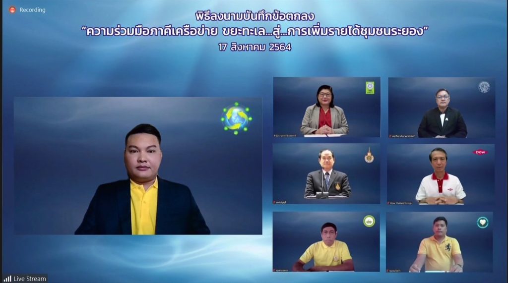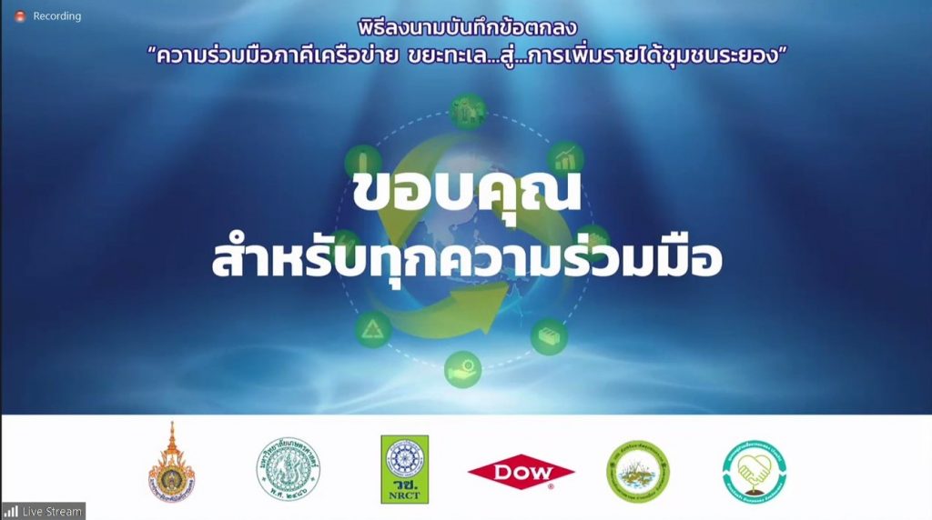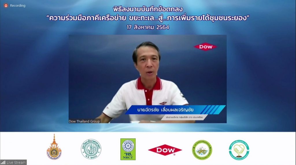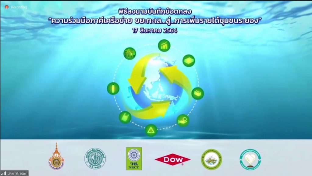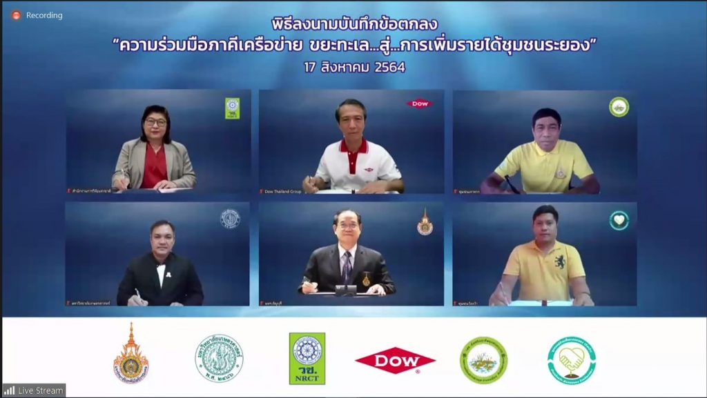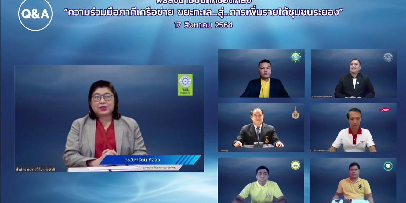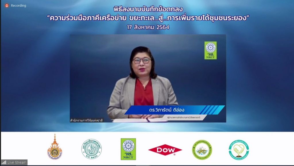 วันที่ 17 สิงหาคม 2564 สำนักงานการวิจัยแห่งชาติ (วช.) กระทรวงการอุดมศึกษา วิทยาศาสตร์ วิจัยและนวัตกรรม (อว.) พร้อมด้วยประชาคมวิจัย ได้แก่ มหาวิทยาลัยเกษตรศาสตร์,มหาวิทยาลัยเทคโนโลยีราชมงคลธัญบุรี และกลุ่มบริษัท ดาว ประเทศไทย (Dow) ร่วมลงนามบันทึกข้อตกลงความร่วมมือ โครงการ “ขยะทะเล…สู่…การเพิ่มรายได้ชุมชนระยอง” ร่วมกับกลุ่มชุมชน จ.ระยอง ประกอบด้วย วิสาหกิจชุมชนส่งเสริมอาชีพชุมชนเกาะกก และ หมู่บ้านเอื้ออาทรจังหวัดระยอง (วังหว้า) เพื่อถ่ายทอดนวัตกรรมการผลิตวัสดุก่อสร้างจากพลาสติกใช้แล้วให้กับชุมชน หวังสร้างรายได้ ยกระดับคุณภาพชีวิต และลดปัญหาขยะในทะเลไทยอย่างยั่งยืน ผ่านสื่ออิเล็กทรอนิกส์ออนไลน์