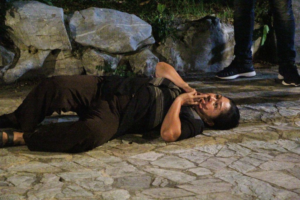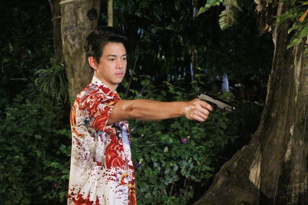 ฉากต่อไปถือเป็นฉากต่อเนื่อง ซึ่งเป็นคิวของ ป้าศรี ที่ยืนด้วยอาการตัวสั่น เก็บภาพได้สักพัก ทีมงานก็ให้คิวนักแสดงสมทบที่เล่นเป็น สมุนเทิดไท เข้าฉาก แล้วก็พาตัว ป้าศรี ไปให้สองพ่อลูกสายโหดเค้นความจริง นักแสดงต่อไดอะล็อกกันไปมา จนถึงคัทที่ ทัพไท ตบหน้า ป้าศรี ทำให้ ป้าศรี กลิ้งลงไปนอนกับพื้น หลังจากถูกตบ ป้าศรี ก็เกิดความแค้น จนเอ่ยปากด่าทอ และสาปแช่งสองพ่อลูกสายโหด ทำให้ ทัพไท ตัดสินใจหยิบปืน และทำร้ายคนแก่อย่าง ป้าศรี ด้วยความโหดเหี้ยม!!