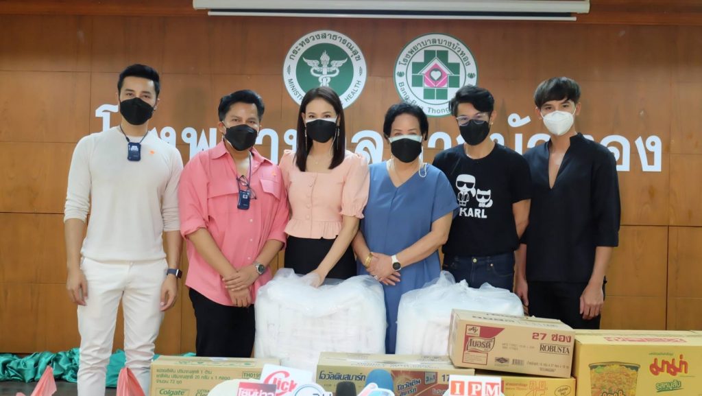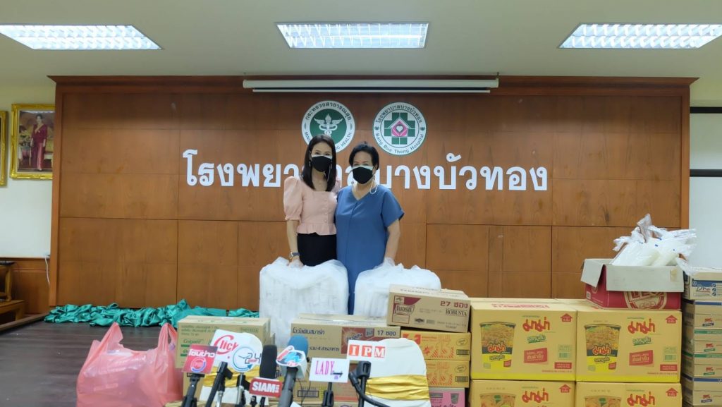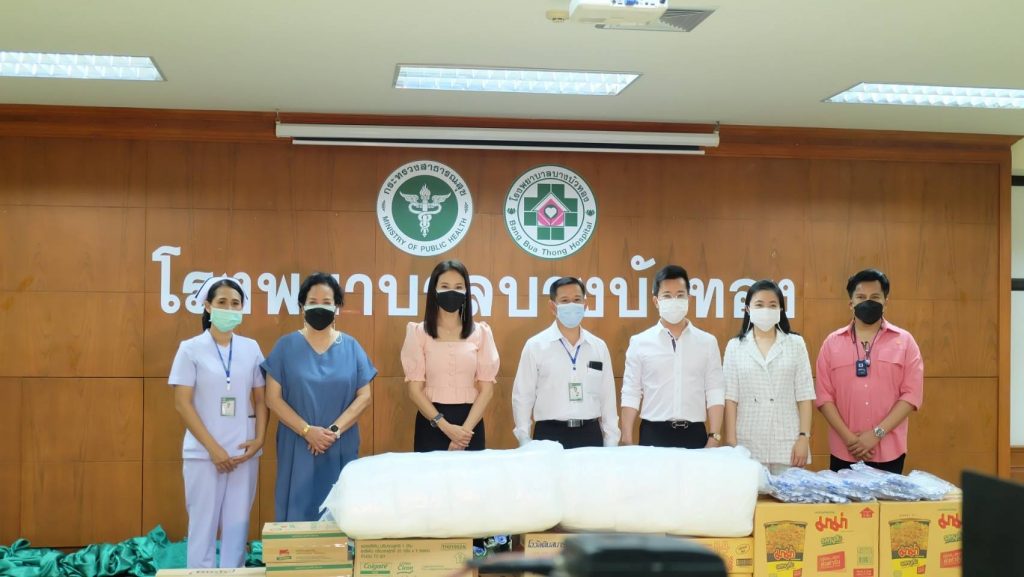 นายแพทย์พุฒิพงศ์ ภูมิสุวรรณ ผู้อำนวยการ AIC Clinic เข้ามอบ ชุด PPE และของอุปโภค บริโภคให้กับ นายแพทย์ประพุทธ ลีลาพฤทธิ์ ผู้อำนวยการโรงพยาบาลบางบัวทอง เพื่อนำไปใช้กับผู้ป่วยที่โรงพยาบาลสนามในการดูแลของโรงพยาบาลบางบัวทอง โดยมี เงาะ-กชกร นิมากรณ์, พญ. ช้องมาศ เลิศสิน, เพ็ญศรี นิมากรณ์, ดร.วโรดม ศิริสุข, ธีร์-ณธีพัฒน์ ถิระไชยบูลย์ และท๊อด-สุทธิพงษ์ นาคแดง ร่วมบริจาคในครั้งนี้ ที่ห้องประชุมสัตตบงกช อาคาร 3 ชั้น 3 โรงพยาบาลบางบัวทอง