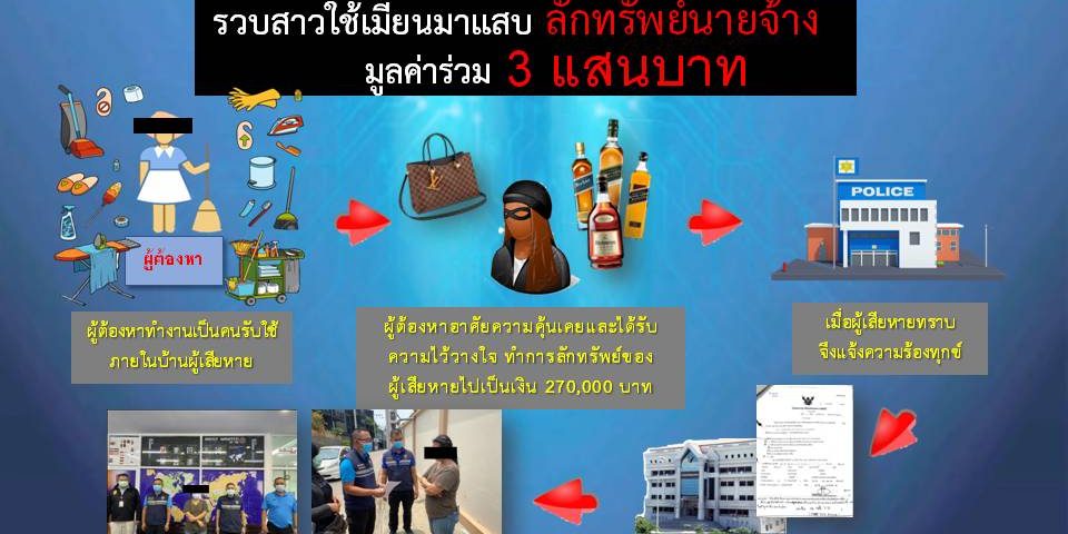ต่อมาเมื่อนายจ้างพบว่ามีทรัพย์สินบางส่วนสูญหายไป จึงได้สอบถามผู้ต้องหา ซึ่งผู้ต้องหาให้การรับสารภาพว่า ได้ลักทรัพย์จำนวน 6 รายการดังกล่าวข้างต้นไปจริง ผู้เสียหายจึงไปแจ้งความร้องทุกข์กับ พงส.สน.พหลโยธิน เพื่อให้ดำเนินคดีกับผู้ต้องหา ต่อมาเมื่อศาลอาญาได้อนุมัติหมายจับ ที่ 1658/2562 ให้จับตัว น.ส.เมียวฯ ในความผิดฐาน “ลักทรัพย์ที่เป็นของนายจ้าง” กก.1 บก.สส.สตม. จึงได้ออกสืบสวนหาตัวผู้ต้องหาจนทราบว่า ได้หลบหนีการจับกุมไปพักอาศัยภายใน ซอยนาคนิวาส 48 แยก 7 ถนนนาคนิวาส แขวงลาดพร้าว เขตลาดพร้าว กรุงเทพฯ จึงได้ไปตรวจสอบเมื่อพบตัวผู้ต้องหาจึงได้แสดงหมายจับพร้อมจับกุมตัว นำส่งพนักงานสอบสวน สน.พหลโยธิน ดำเนินคดีตามกฎหมายต่อไป
