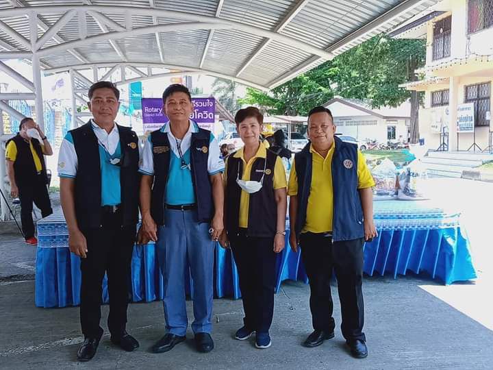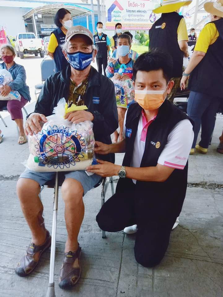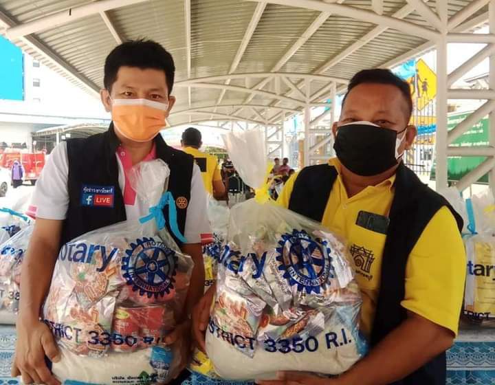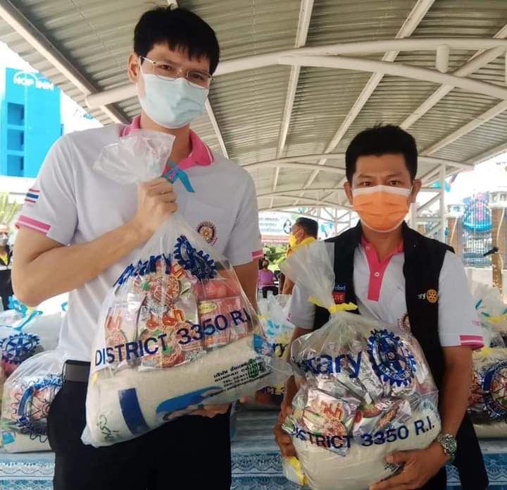 ศาสตราจารย์ คลินิก เกียรติคุณ นายแพทย์ วิรุณ บุญนุช ผู้ว่าการภาค 3350 โรตารีสากล 2564-2565 พร้อมด้วย นายศิริชัย อัมพร ผู้ช่วยผู้ว่าการภาค 3350 โรตารี่สากล ได้ร่วมกันมอบถุงยังชีพในครั้งนี้ด้วย
